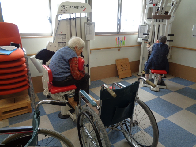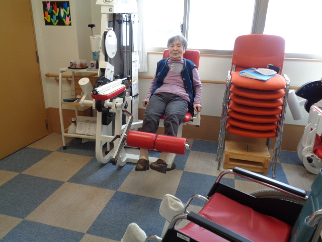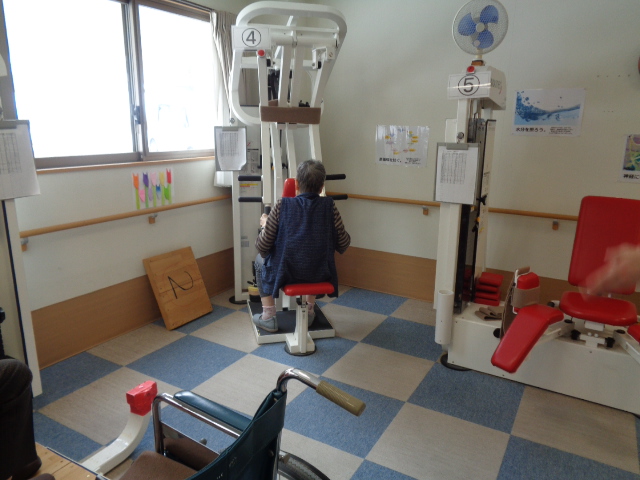 パワーリハビリ室は入居者の方の掛け声が響き皆さん真剣に取り組んでいます‼