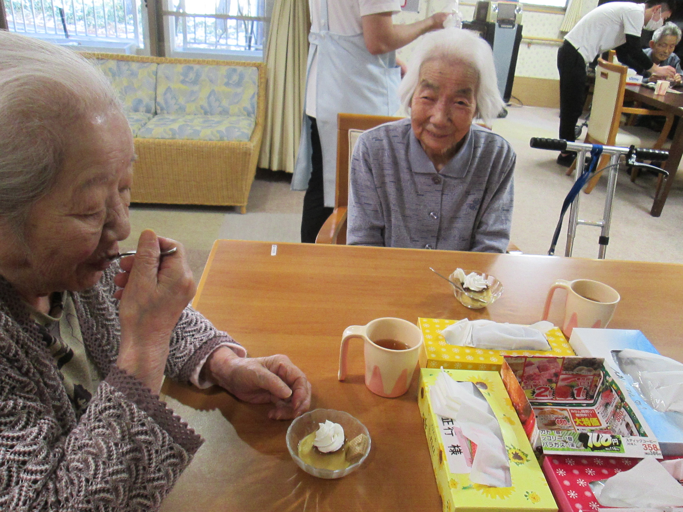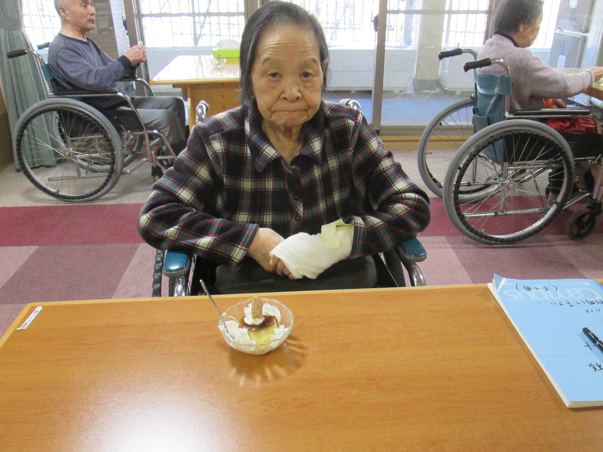 本日のおやつは🍮に生クリームとウエハースをトッピングして皆さんに