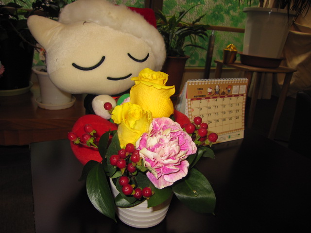 今日のお花は薔薇・カーネーション・ヒベリカム・ルスカスです!