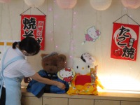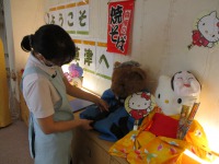 看護師の徳江です(^_-)-☆玄関ホールは「お祭り」の装飾に!これは可愛い~はっぴと浴衣姿がピッタリの二人(=^・^=)浴衣姿のキティが持ってる花火がポイント🎇二人にも是非会いに来てくださいね