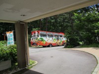 施設の前を「八ッ場ダムの水陸両用車が!」もうすぐ運行のPRで草津町内を走っている様です、新緑の中を走るカラフルな模様が観光気分を盛り上げますね(=^・^=)楽しみです!