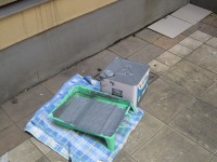 事務員の黒岩です(^^)/本日は昨日塗った防水下地の上に防水塗料を塗ります!これで換気扇の下からの湿気でボロボロになった壁がしっかり補修~さあ梅雨に入る前に完成を目指しましょう