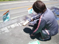 ケアマネージャーの成澤です(^^♪今私がいるのは車寄せ天井の上~♨温泉ガスので劣化してひびだらけの屋根の補修、勿論DIY!今日はまず「防水シーラー」で下地塗りです~今日はよく乾かして後日塗装です