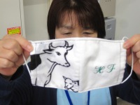 施設長の福田です(=^・^=)本日のマスクはケアマネージャーの成澤さん作!🐄酪農協会の手ぬぐいで作った🐄の親子の絵がポイント~丑年の私にピッタリ(笑)それにしても可愛い絵ですね~