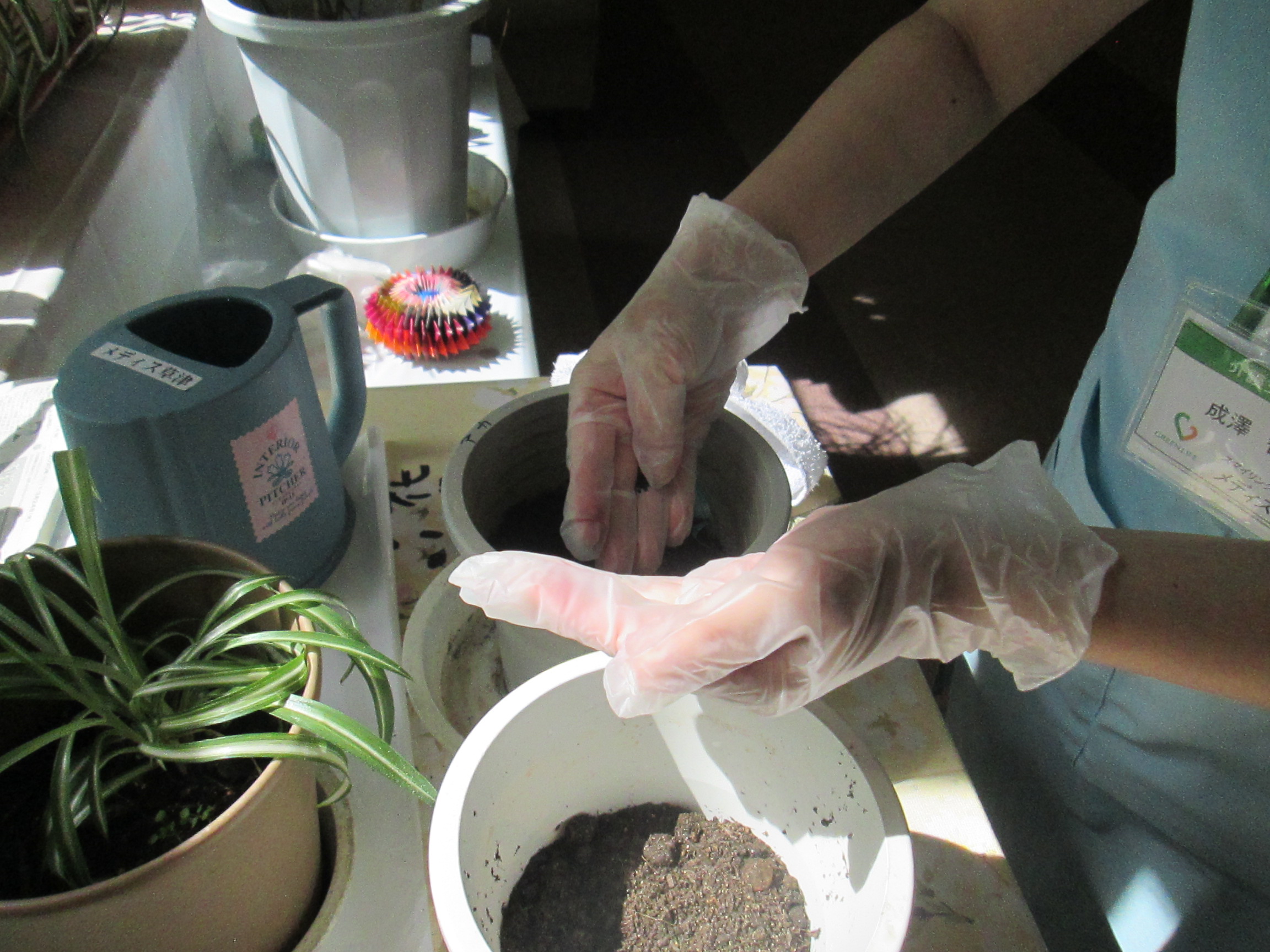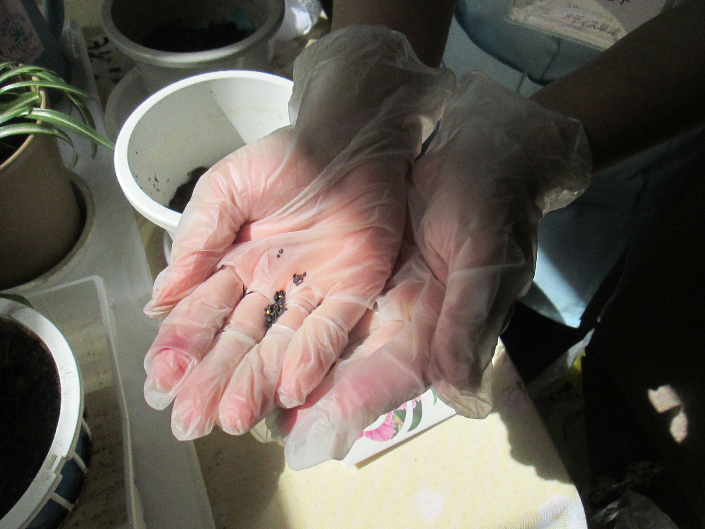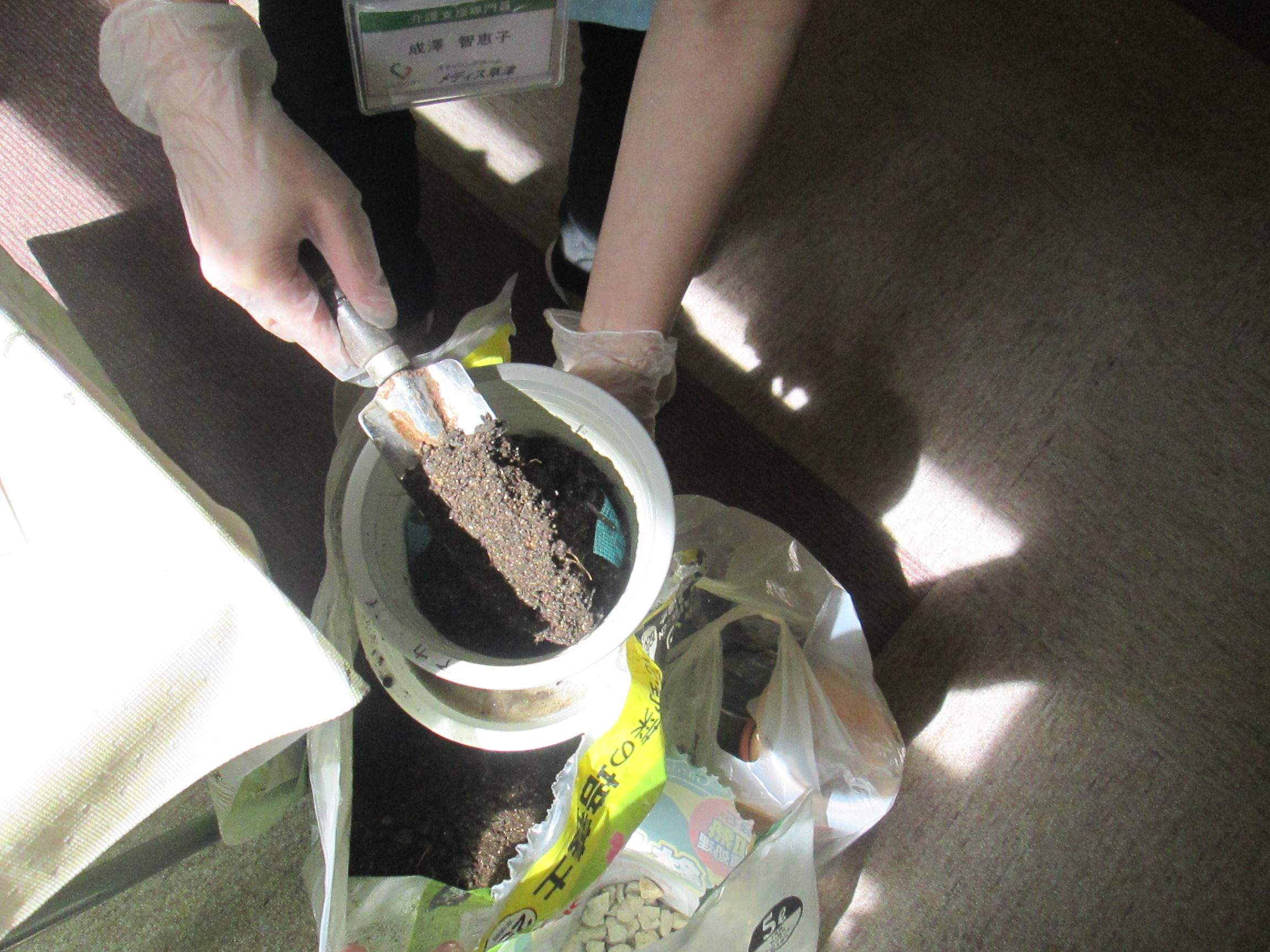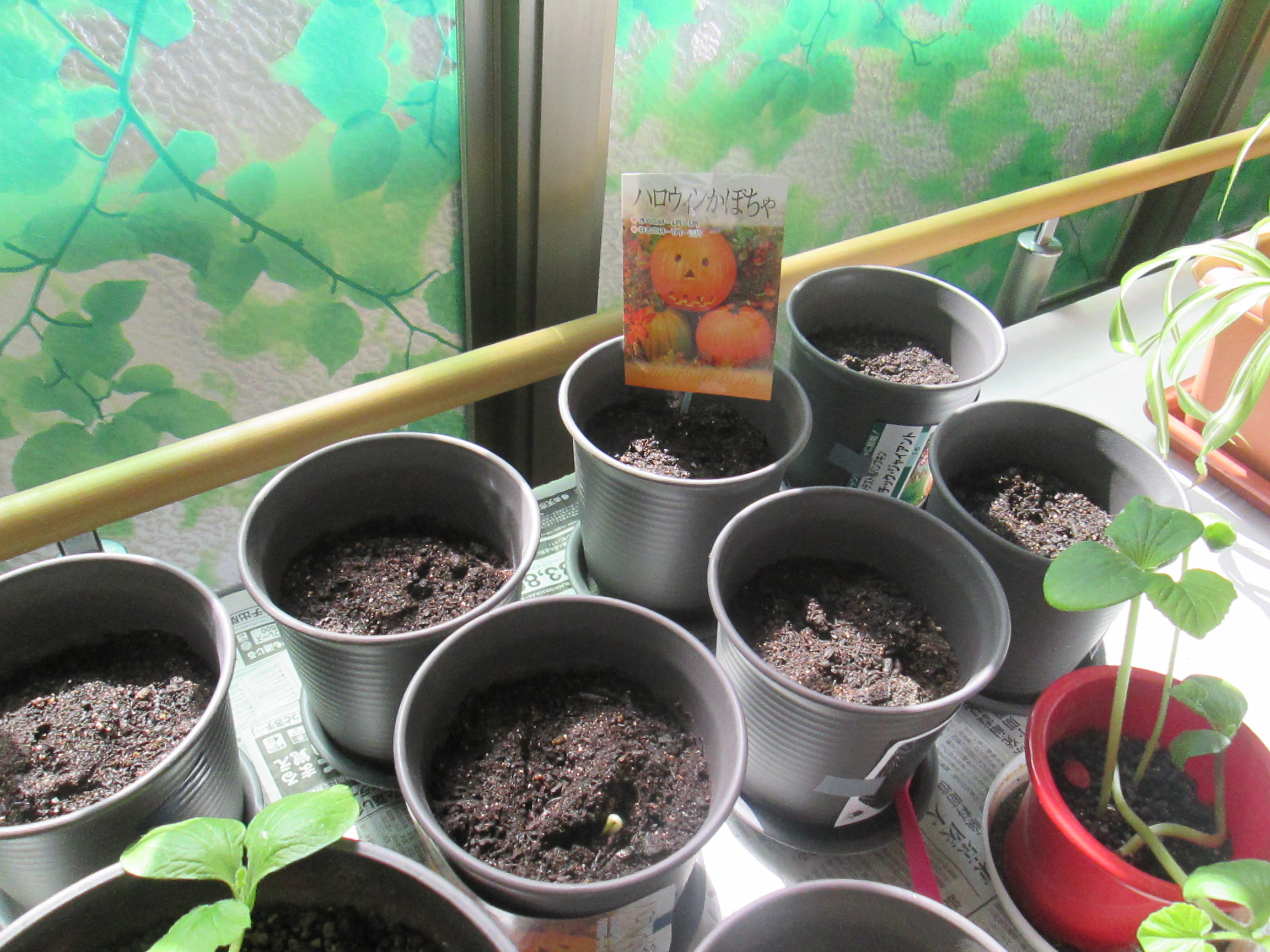 先日入居者様と種蒔きしたハロウィンかぼちゃの芽を発見✨