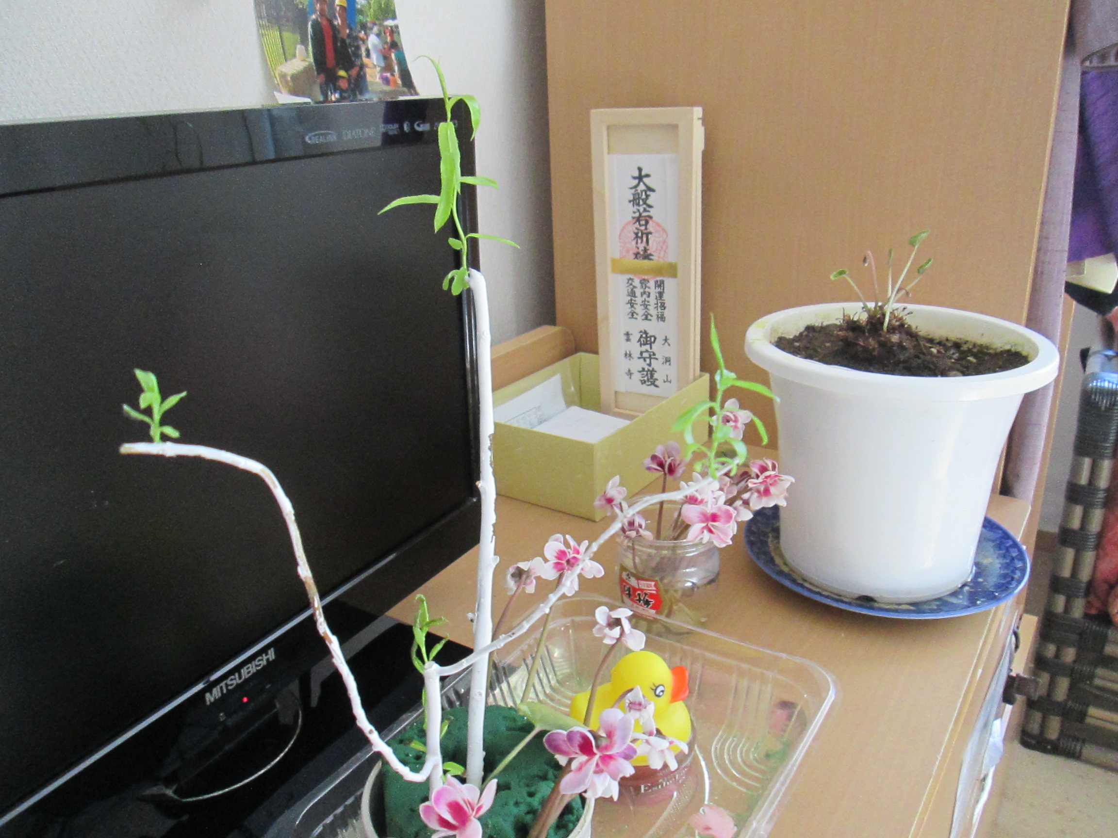 そしてK様のお部屋の先月のフラワーアレンジメント教室の具材の白樺から新芽が‼‼
