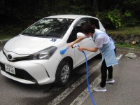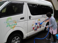 ケアマネージャーの成澤です!看護師の徳江です!雨が多く白い車体が薄緑色に?(笑)そんな社用車をピカピカに✨さあこれで明日の外出レクも気分良く行けますね~