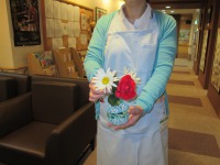 スタッフの宮﨑さんが自宅に咲いていた薔薇とマーガレットを一輪挿しに飾っているところを📷(^^)