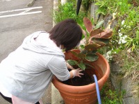 ケアマネージャーの成澤です(^_-)-☆小さな鉢にぎゅうぎゅうに植えられていたゴムの木…新しい芽が出てきたのをきっかけに大きな鉢に!さあこれで思いっきり成長してくれますね~