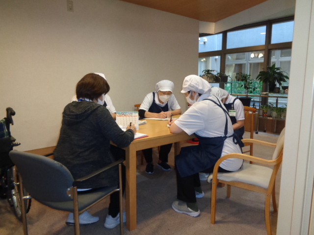 毎月厨房会議を開いています。業務についてや特別メニュー起案など入居者様に喜んでいただけるよう