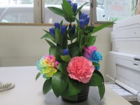本日はりんどう・カーネーション・マルバルスカスを使って皆様思い思いに生けていらっしゃいました(^^♪