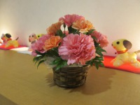 今回はカーネーションとアセビを使って皆様思い思いに生けていらっしゃいました。同じ花でも生け方一つで雰囲気が変わりますね。どのお花もとても素敵に仕上がっていました(^^♪