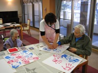 介護リーダーの萩原です!昨年の10周年記念イベントの一環として、全入居者の手形を取って飾ろう!という事になりました。記念すべき10周年と新年を一緒に迎えられたお客様の生きた証ですね。額に入れて近日飾る予定です。