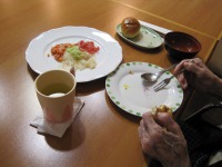 月に1度のスペシャルメニューの登場です!今回のメニューは①生ハム盛り合わせ②ミネストローネ③3種のカルパッチョ④ロールパン⑤ケーキ(プルーン添え)と豪華で美味しいお昼ご飯、元ホテルシェフが料理長の当施設の食事は自慢の一つです。勿論お客様のお身体に合わせてミキサー食や刻み食もご用意しております。