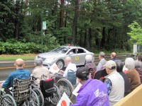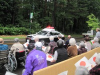 1日繰り上げて東京へお戻りになられる両陛下をお見送りしようとたくさんのご入居者様が施設入口にお集りになりました。なんと数分前まで降っていた雨が上がり、みんな笑顔に…そして両陛下を乗せたマイクロバスが近づきました。なんと天皇陛下は立って下さり、美智子様は身を乗り出してご入居者様の声援にお応え下さいました。その後大勢の警察官も撤収され少し寂しい草津界隈です。