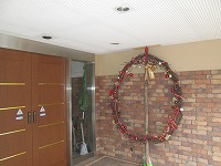 施設内はクリスマス一色。玄関には、昨年製作した巨大なリースを今年も装飾しお客様をお迎えしております。