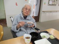 今月は、お昼にお赤飯・清まし汁・豚の塩だれ炒め・酢味噌和え・フルーツでした。