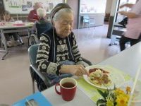 おやつは,ホットケーキイチゴソース添えを提供しました。