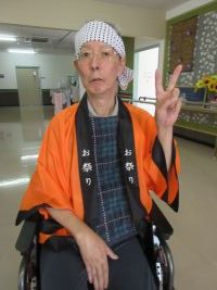 お神輿わっしょい。私自分でやりたい。 (軽く作ってあります。) 見守りの中わっしょいわっしょい^^ 良いリハビリ効果もありますね。