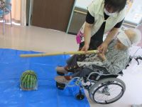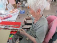 99歳の優しい入居者様~~花火がすぐにできるようにしてくださいました。器用にハサミで袋切ってくださってます。(見守りの中)