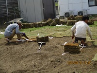 職人さんが手際よく芝生を敷き詰めてくれています。