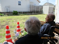 端から丁寧に草刈りしている様子を入居者様が見守っていました(*^^*)