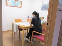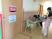 先日、感染対策シュミレーションを行いましたが、シュミレーションに参加できなかったスタッフが別日に看護師指導のもと研修しています。