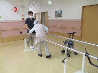 平行棒を使って、真っすぐ後ろ歩きをする練習をしています。