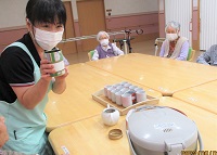 入居者様に囲まれて注目を浴びながらお茶を入れるスタッフ。