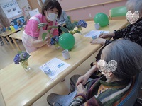 「さて、ここで問題です。テーブルの上にはアジサイが飾られていますが、これは何の葉っぱでしょう!」と、入居者様にただの葉っぱを見せるスタッフ。