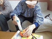 次はグル―ガンを使って小さなカボチャに何かを張り付けています。