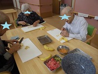 リンゴ・キウイ・スイカ・バナナ・みかん・手作り寒天を切って、サイダーにいれます♪