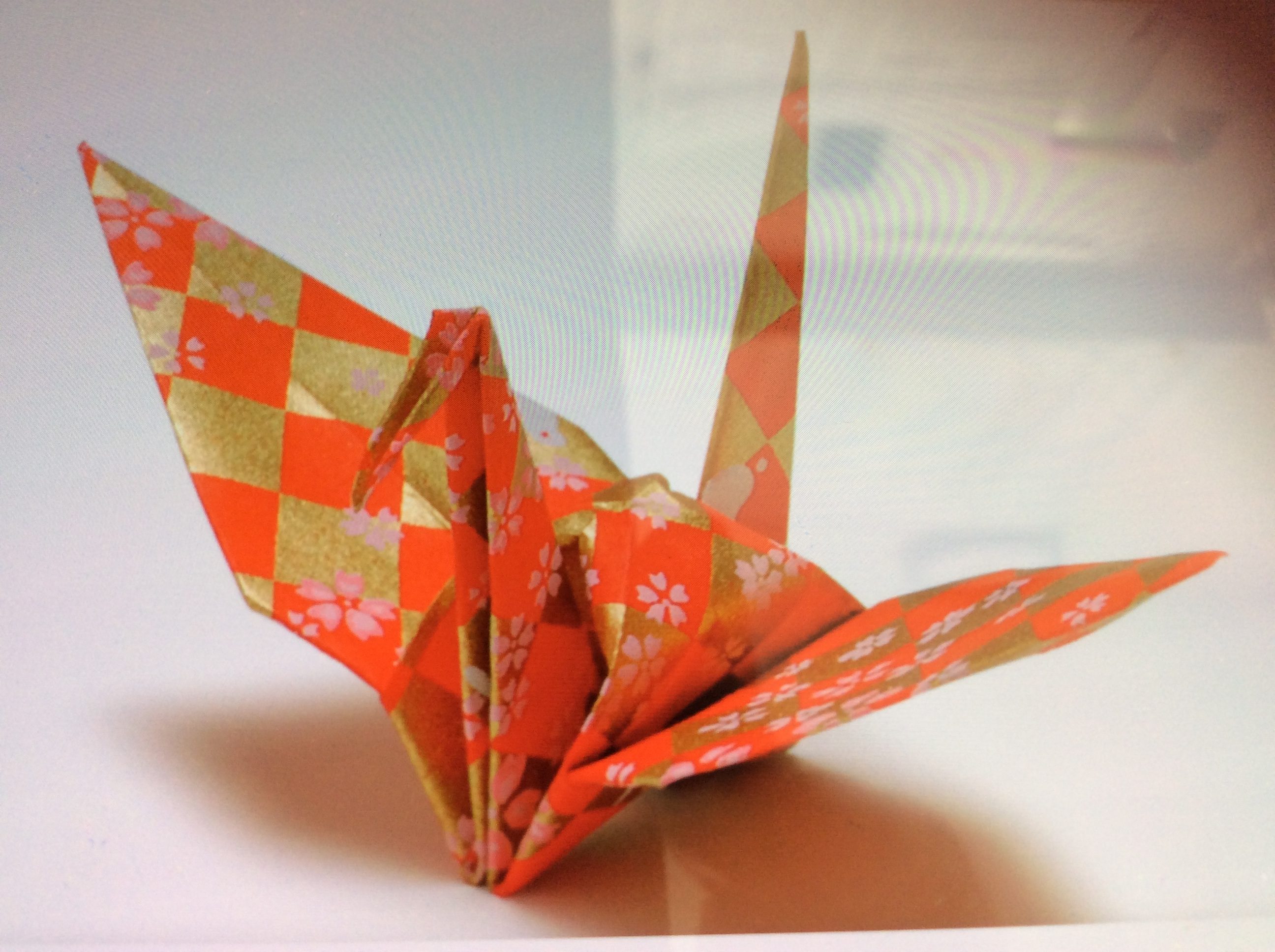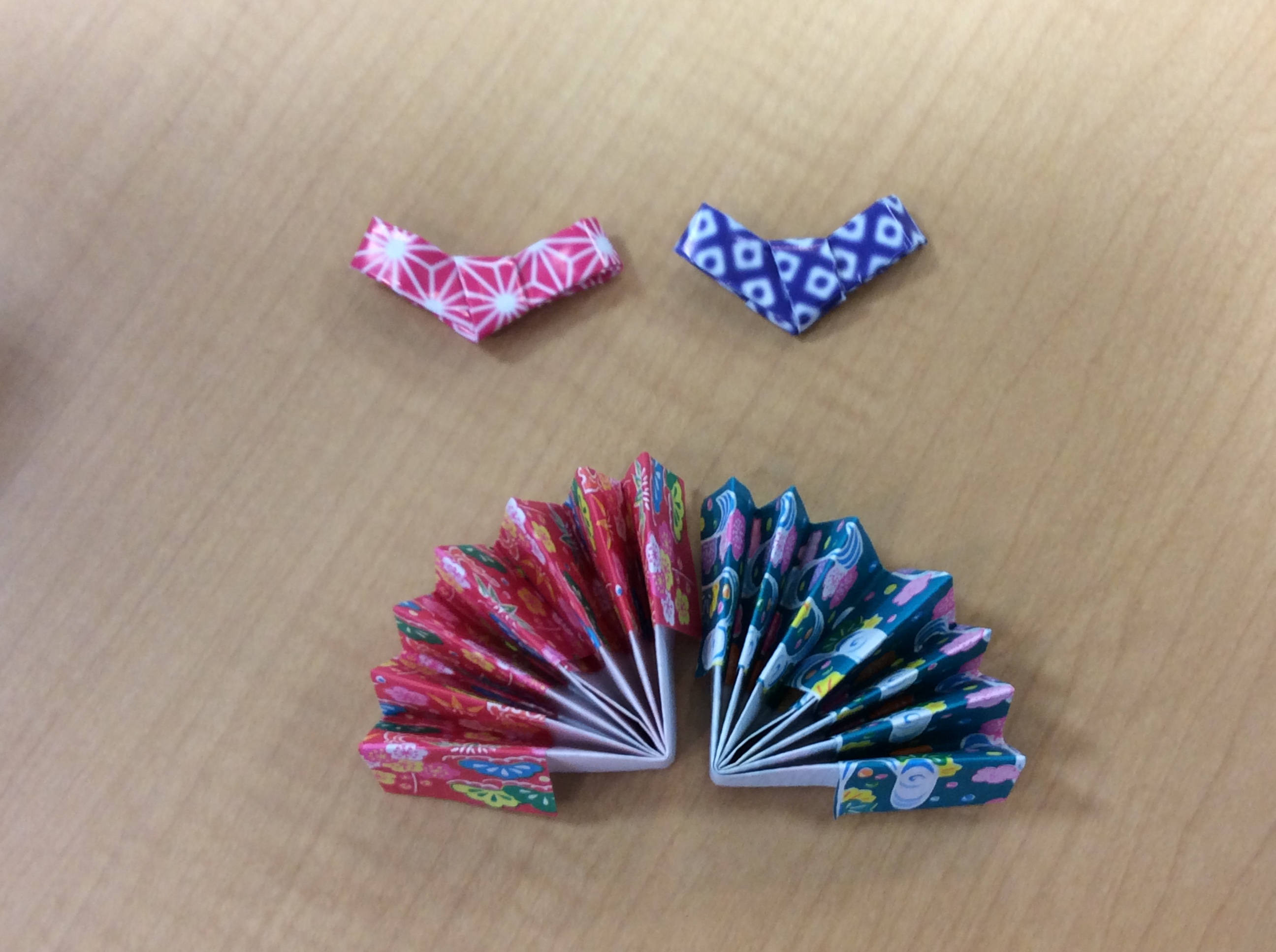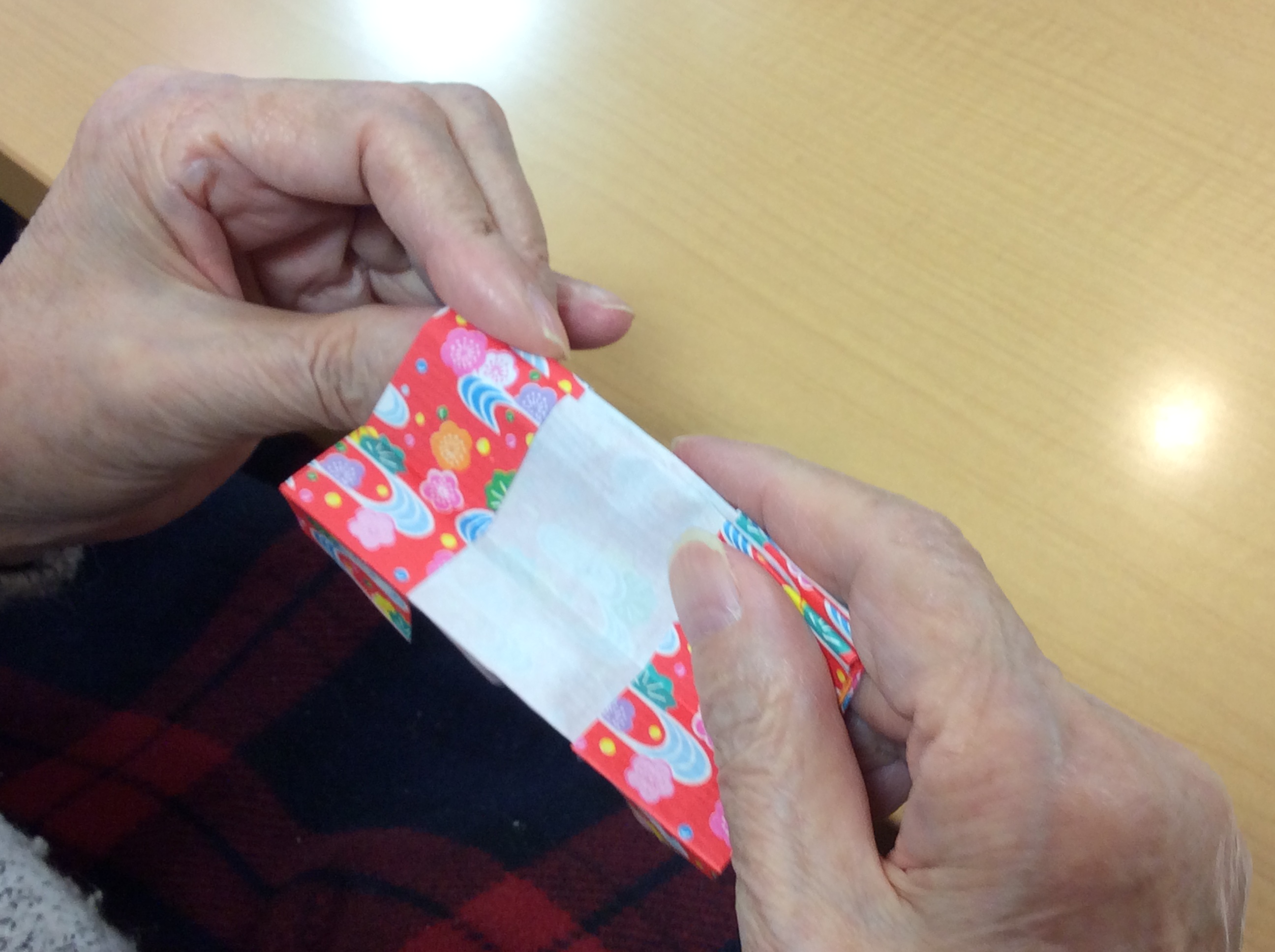 和柄の折り紙を折って、たたんでを繰り返します。