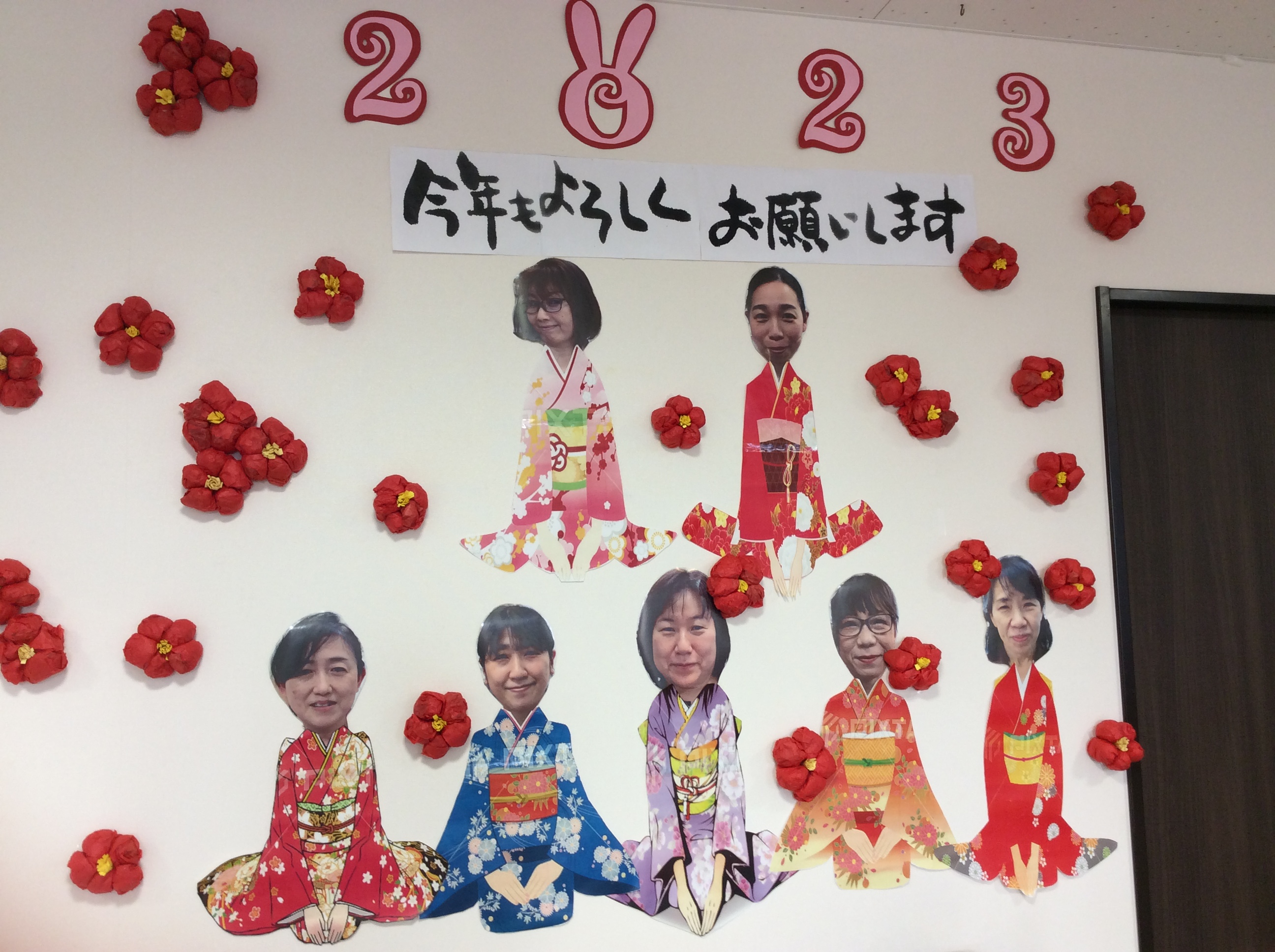 壁画ですが、着物姿のスタッフが揃って新年のご挨拶です。