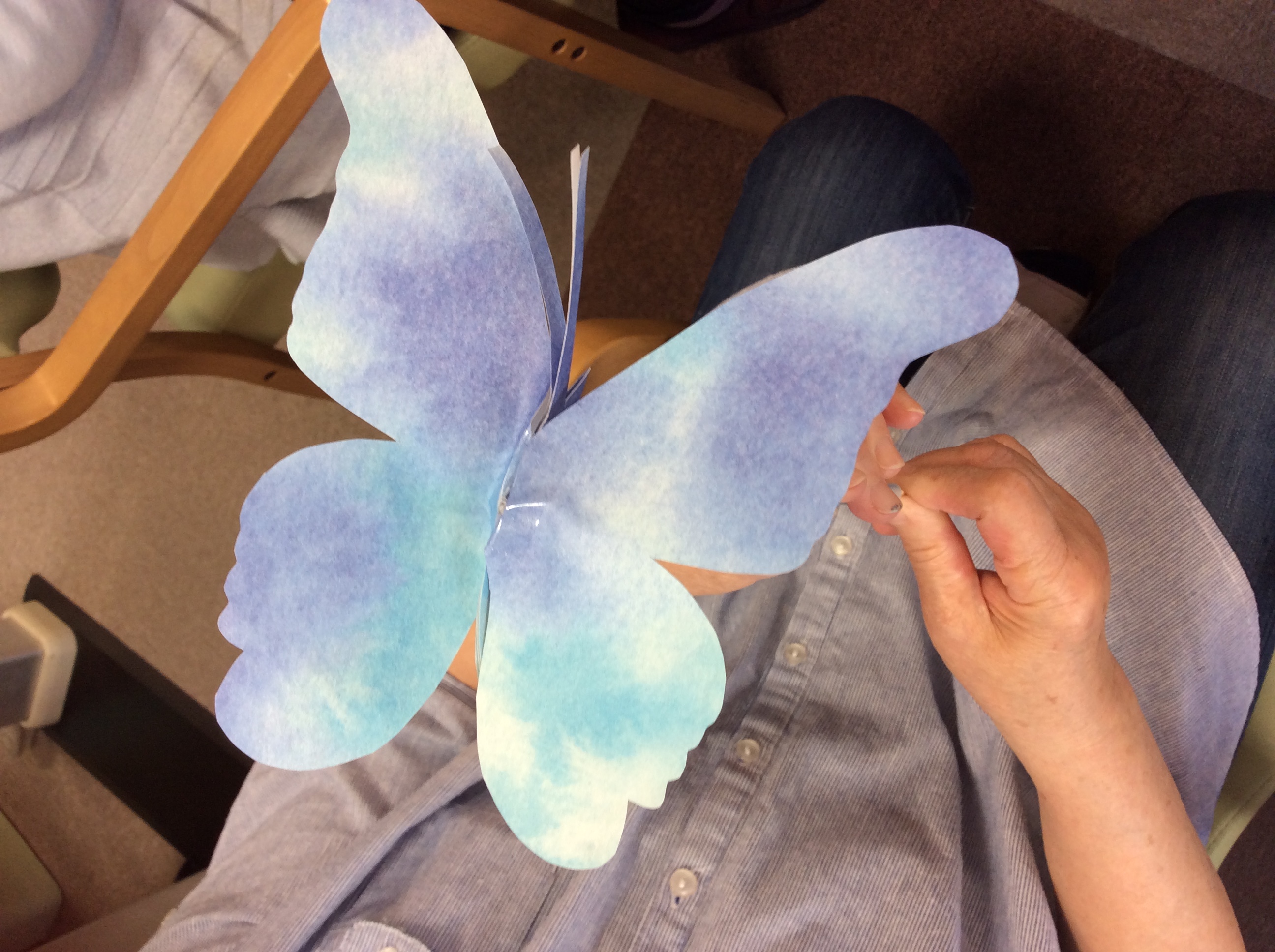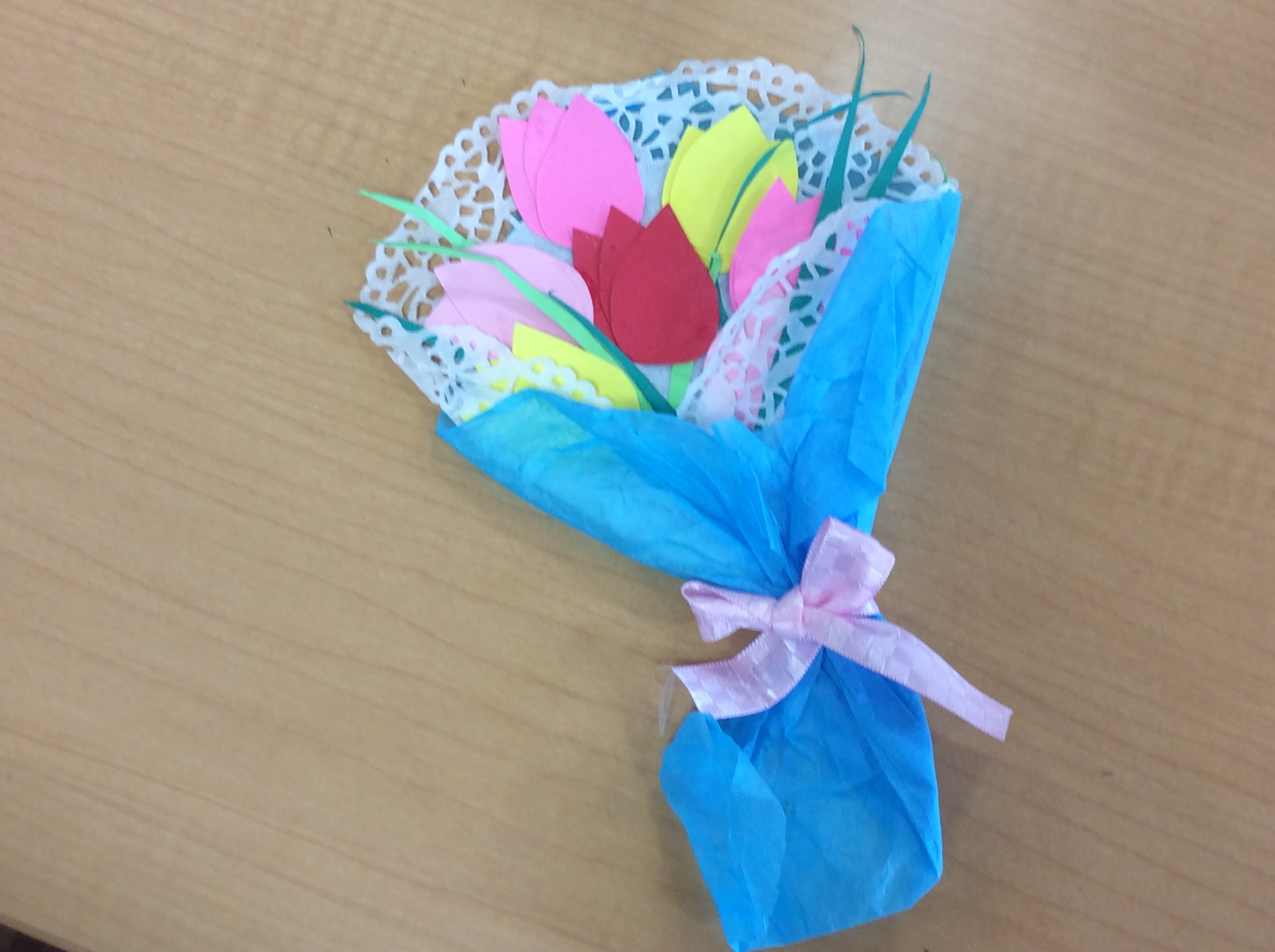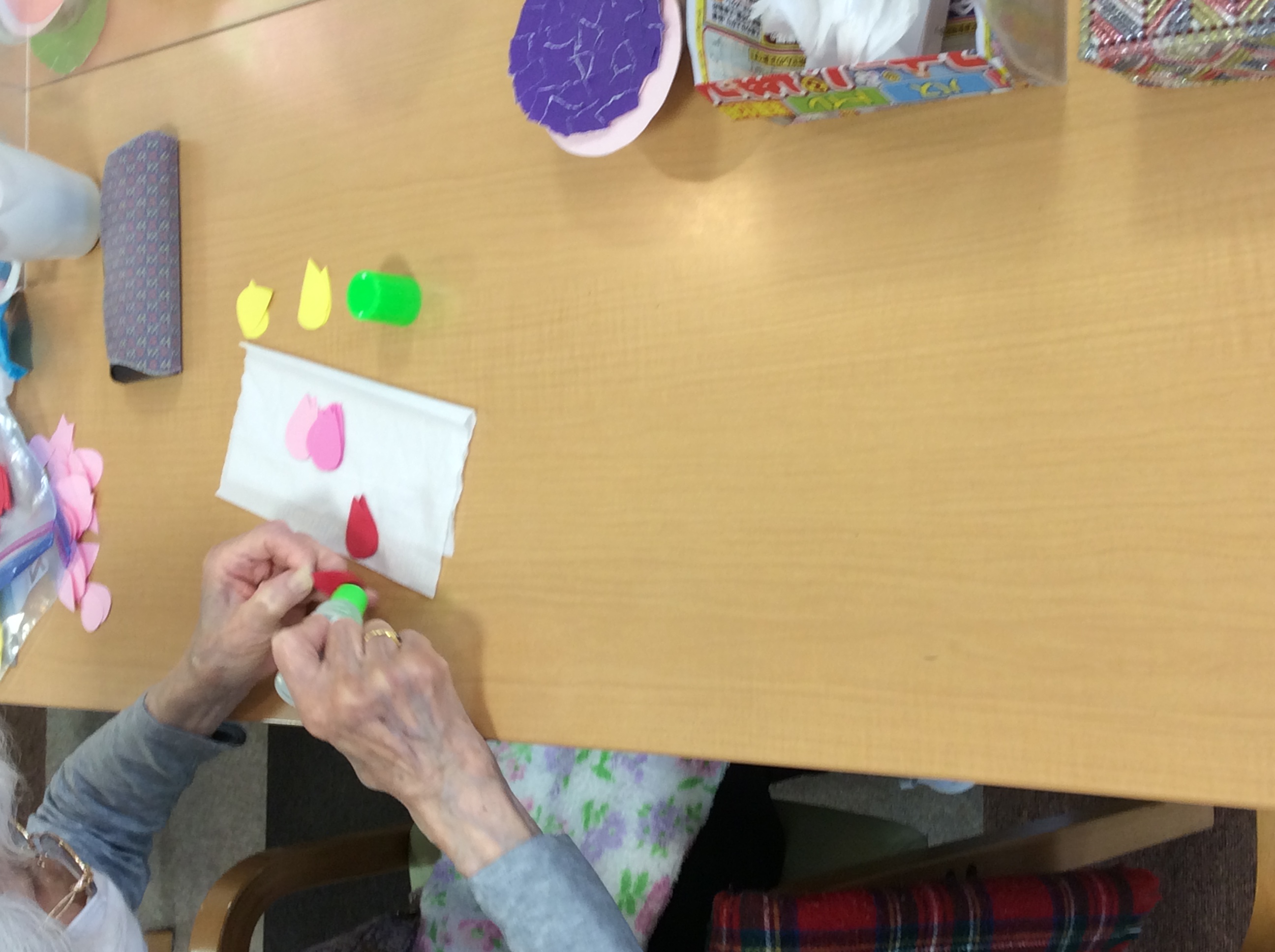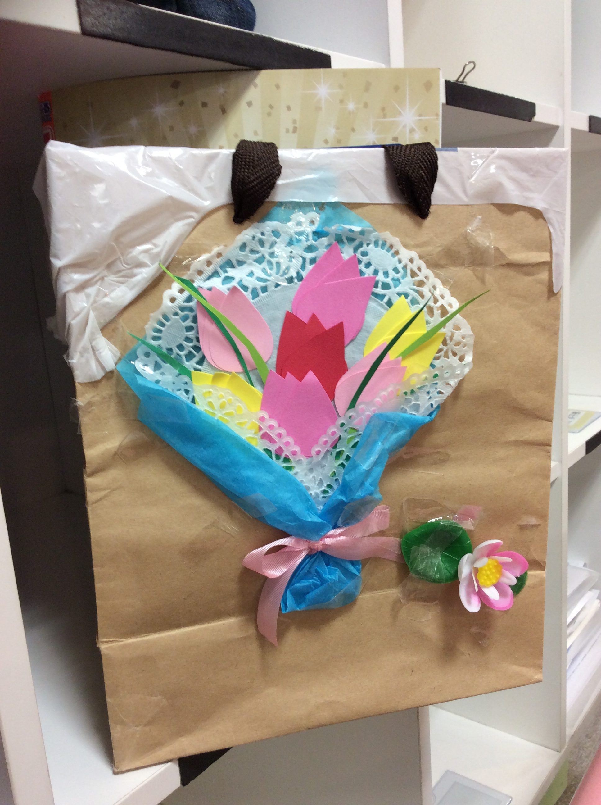 先日、レクリエーションで製作した花束を使用して、ご自分の紙袋をアレンジされ持って来られた方がいました(*^^*)