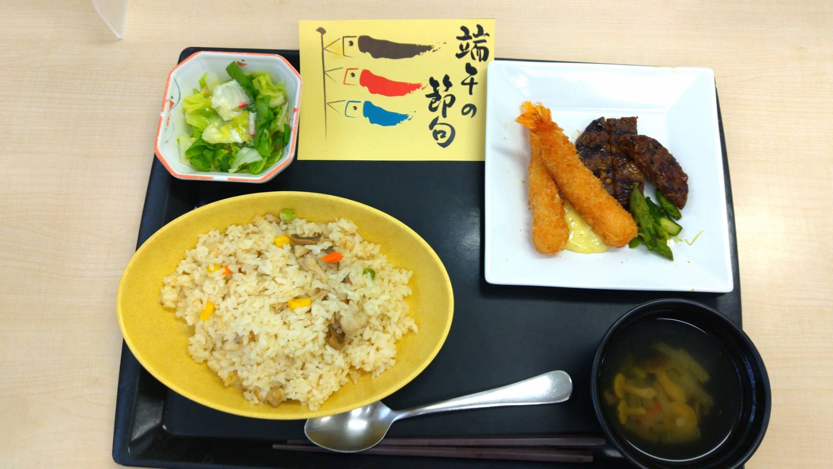 チキンピラフ・エビフライ・ハンバーグ・サラダに野菜スープでした。