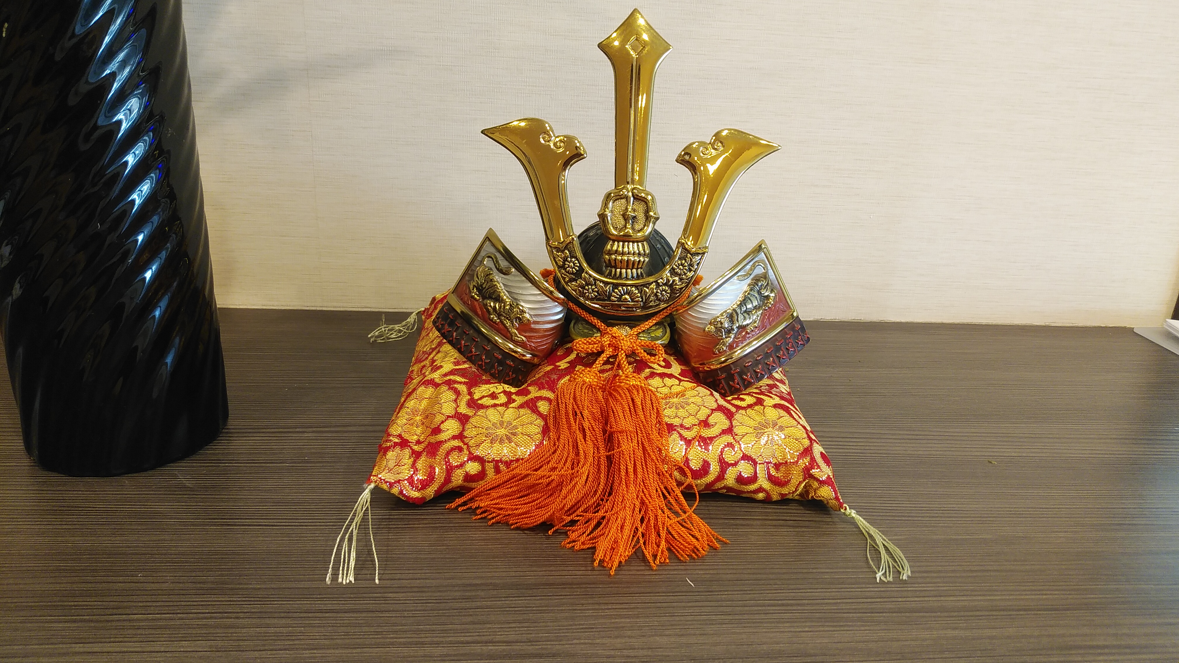 施設の入り口には兜を飾り、菖蒲の花でお客様をお出迎えです。