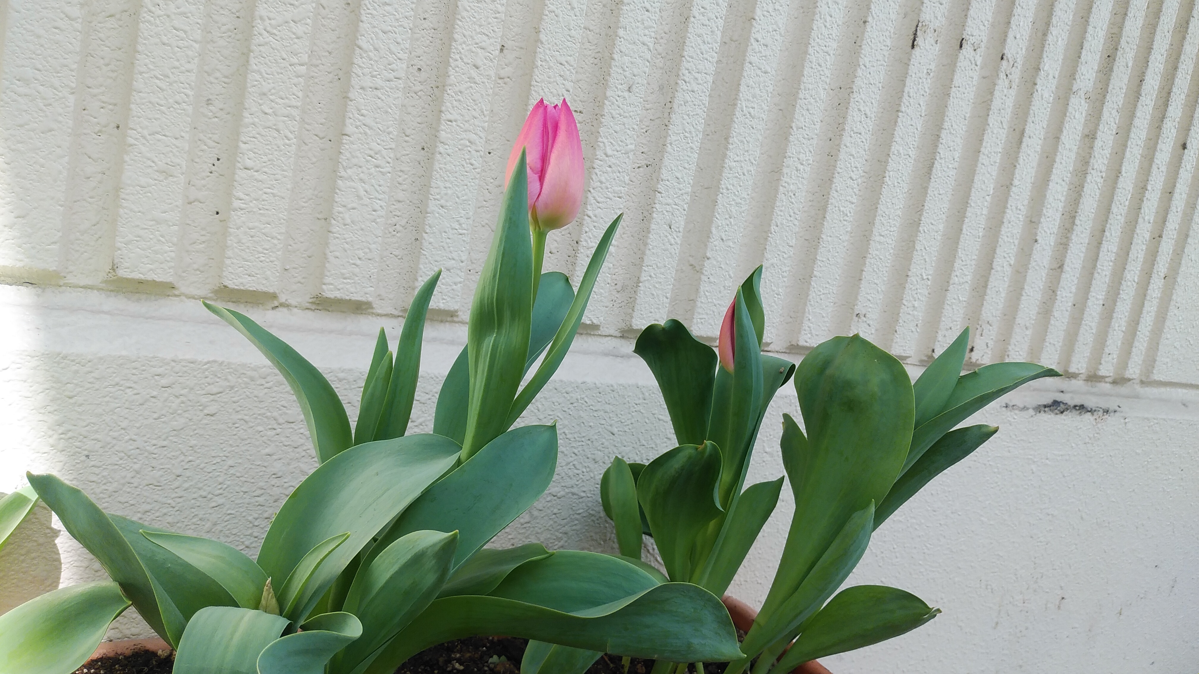 玄関に植えたチューリップが咲き始めました。