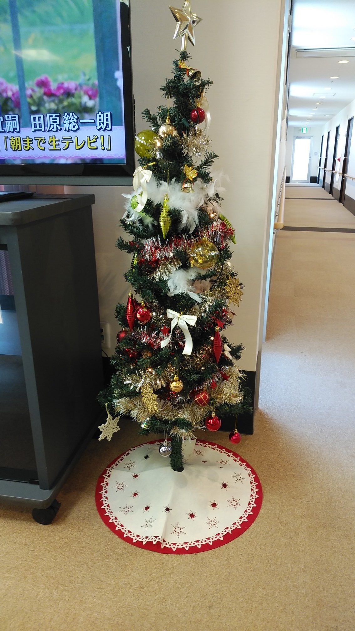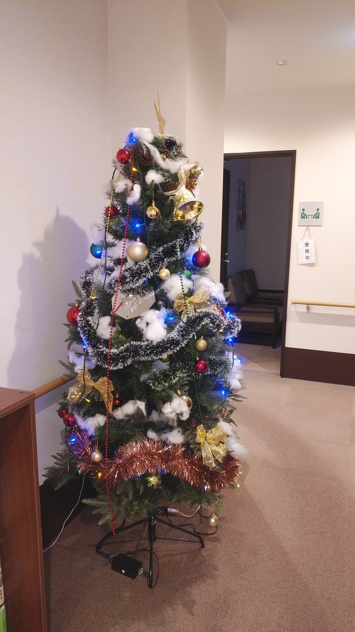 1階ロビーのクリスマスツリーの飾りつけをしました。