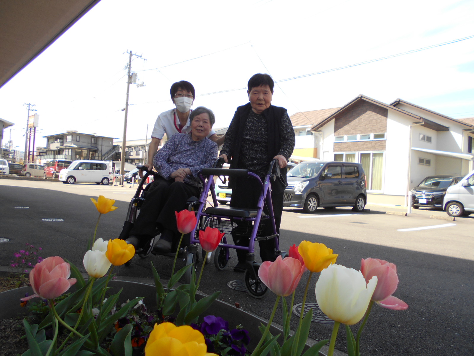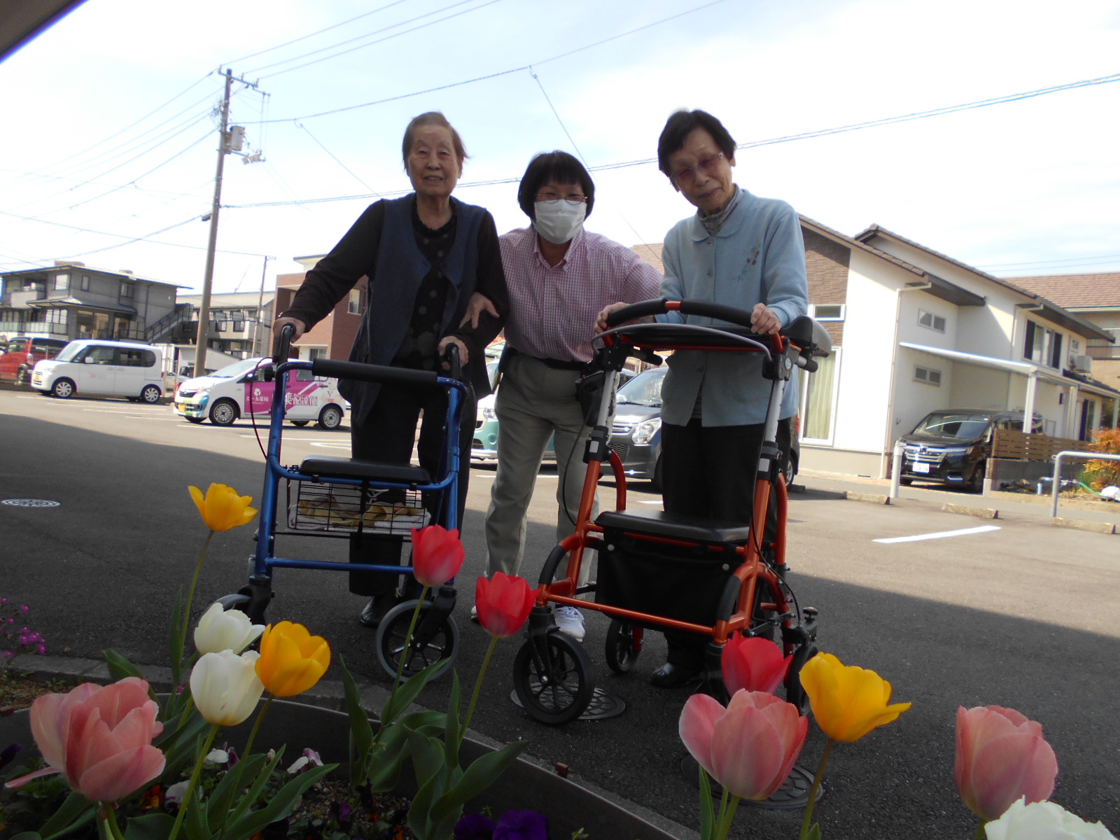 先日入居さんと見に行ったチューリップの色違い(白色・黄色)が