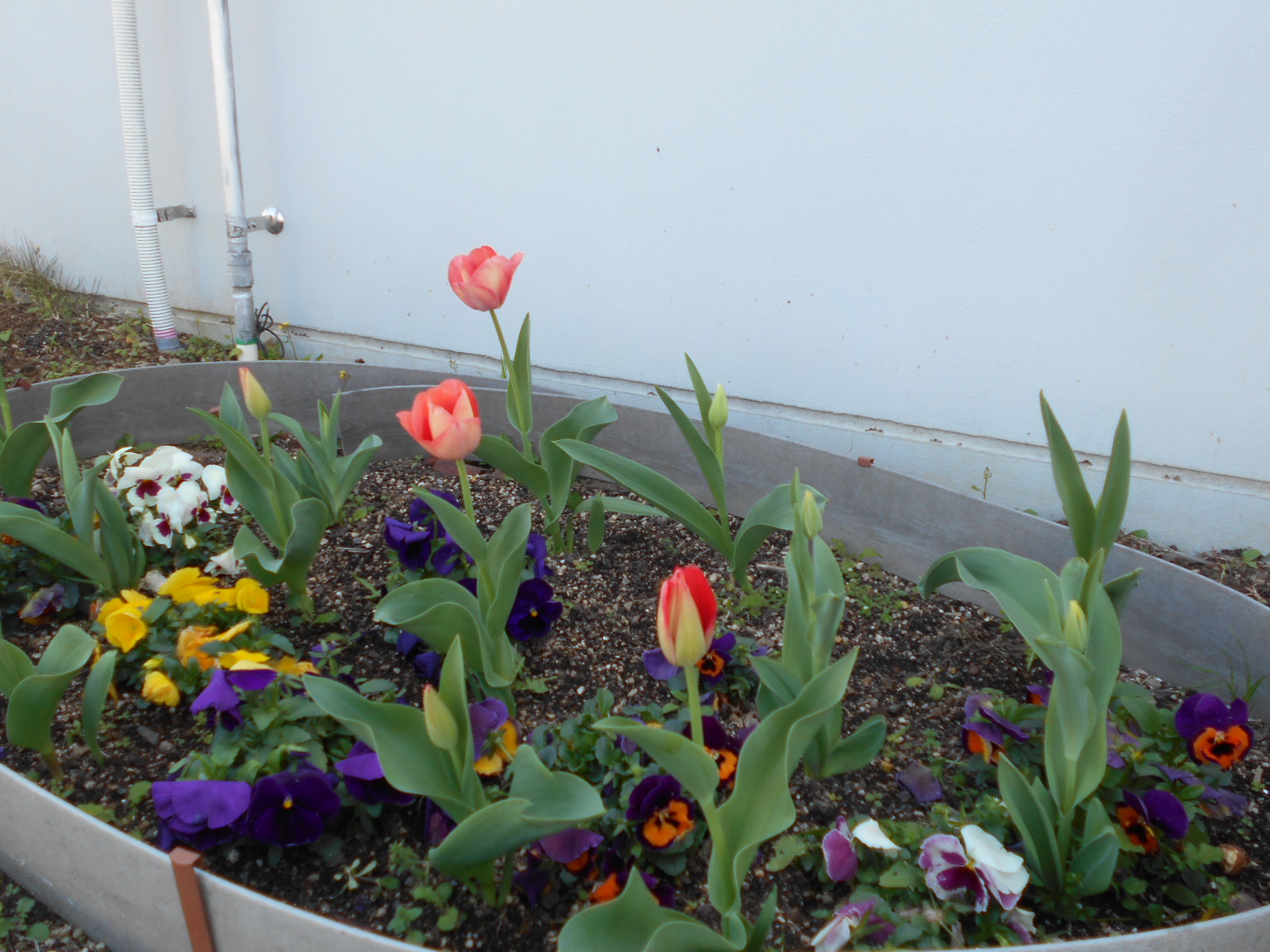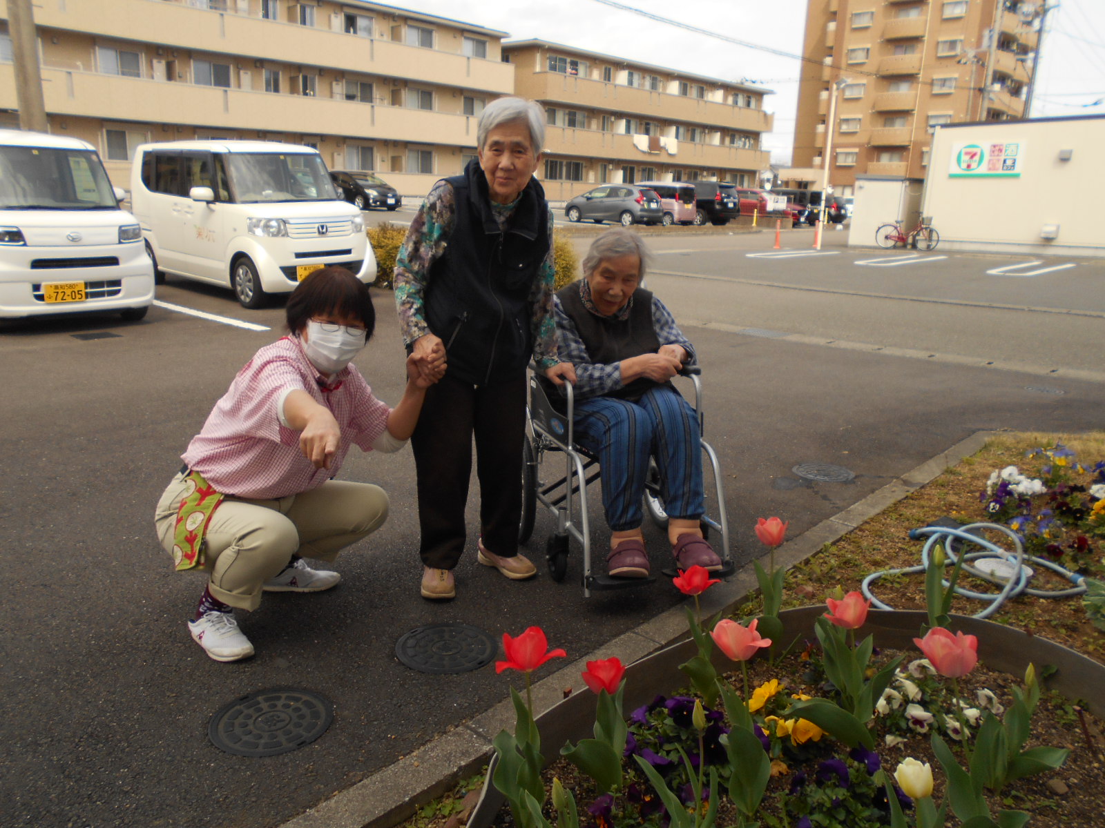 花壇に植えていたチューリップが咲いたので入居者さんと見に行ってみました(*^_^*)
