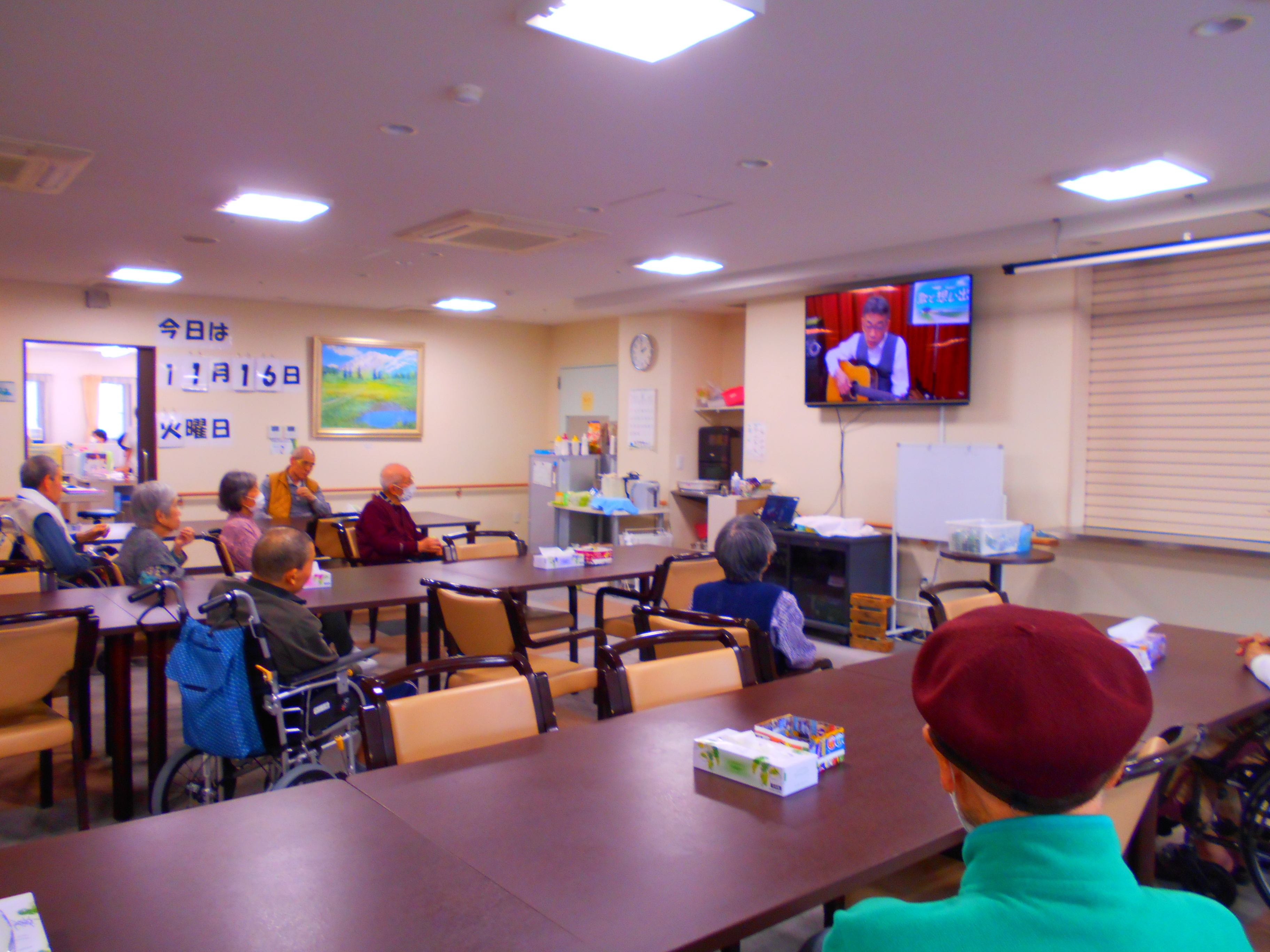 「ギター演奏聴きませんか?」と入居者さんに声を掛けていると、「俺はギターは全然じゃ」と言いながらも食堂に集まってくれました。