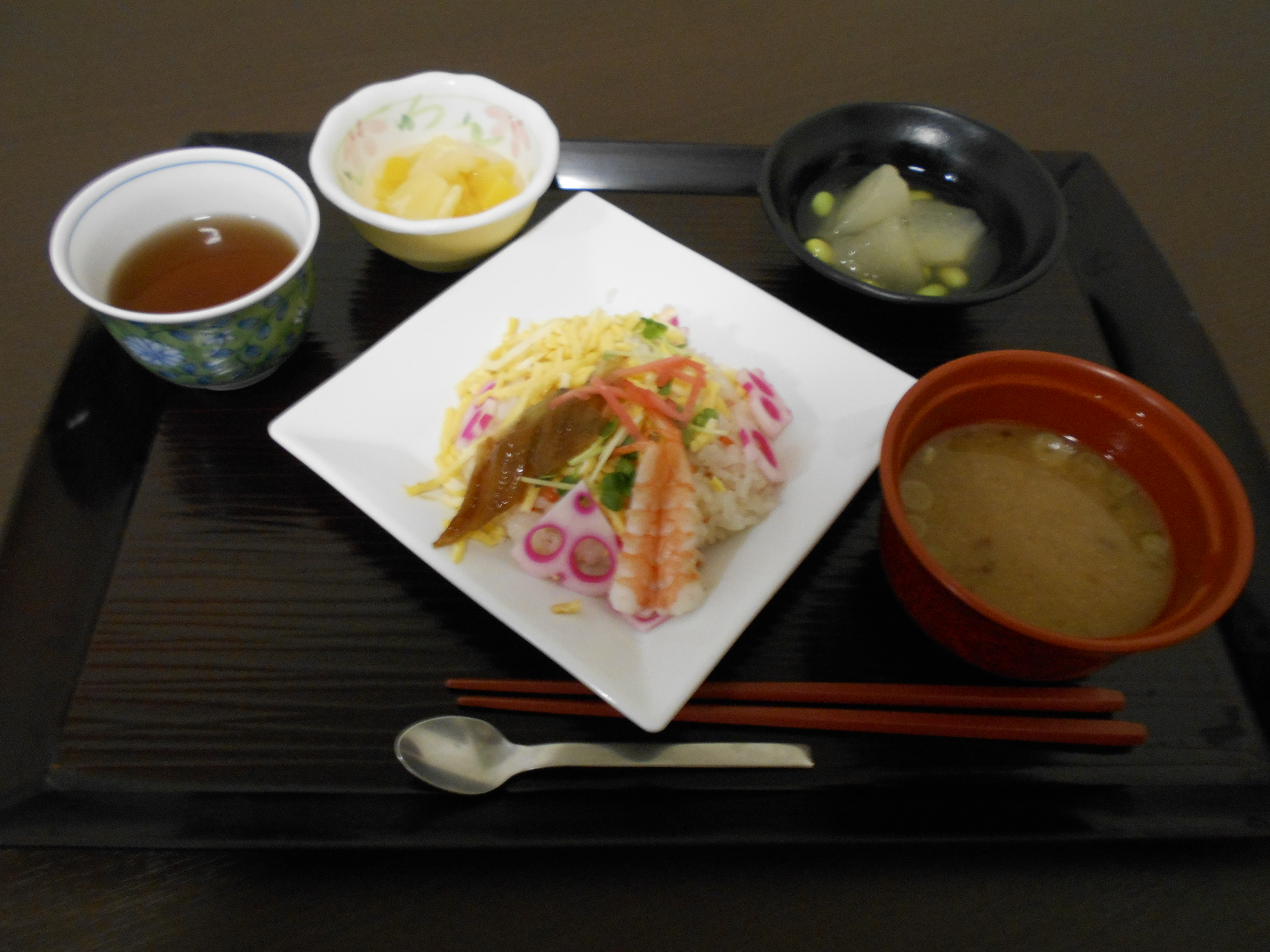 本日の昼食は、ちらし寿司、冬瓜の枝豆あんかけ、お味噌汁にフルーツが付いてました。とても美味しかったです。入居者さんからも「美味しい」のお声沢山いただきました♪