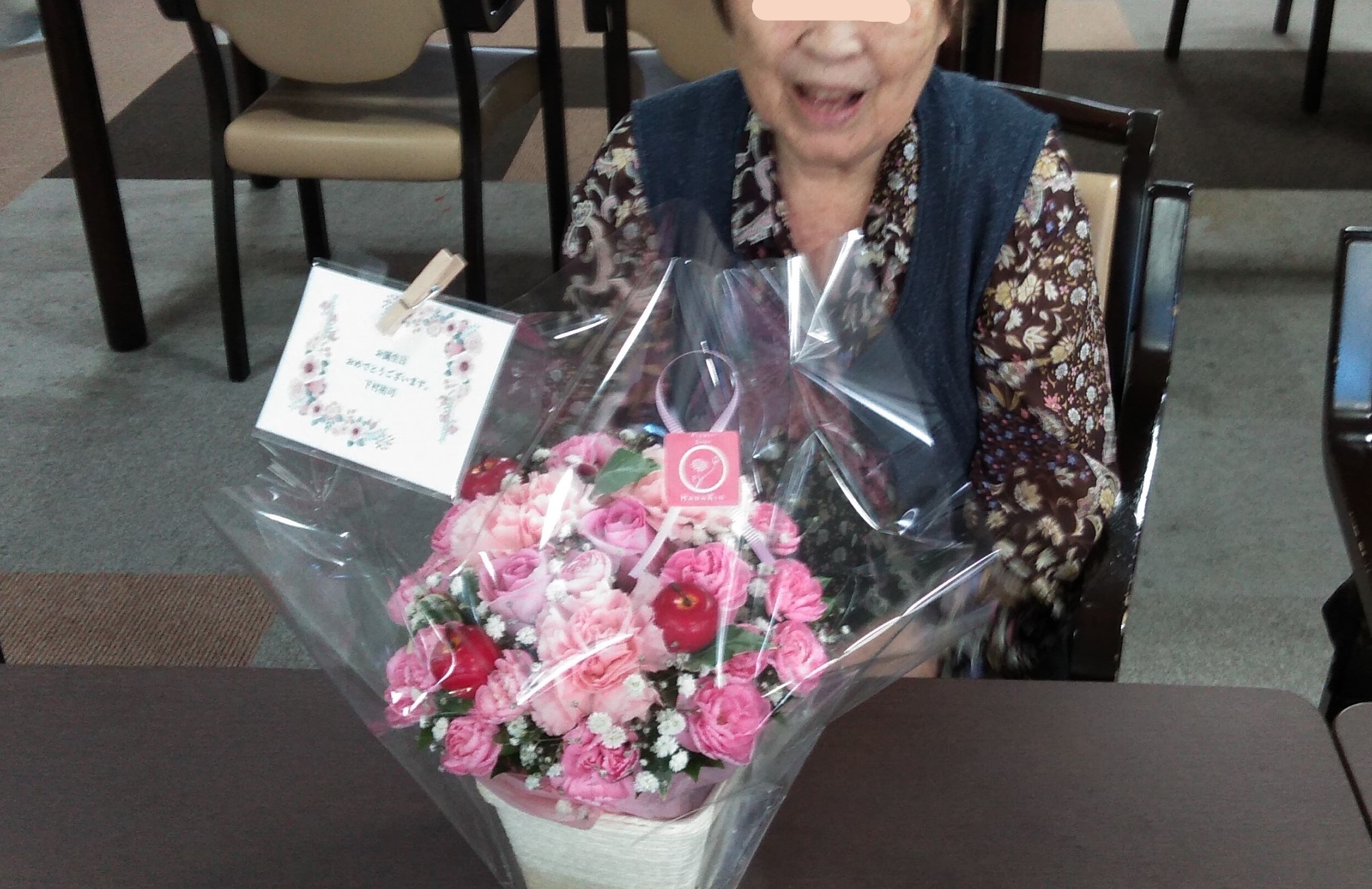 ご家族からのお花のプレゼントをもらって、お2人とも満面の笑みです