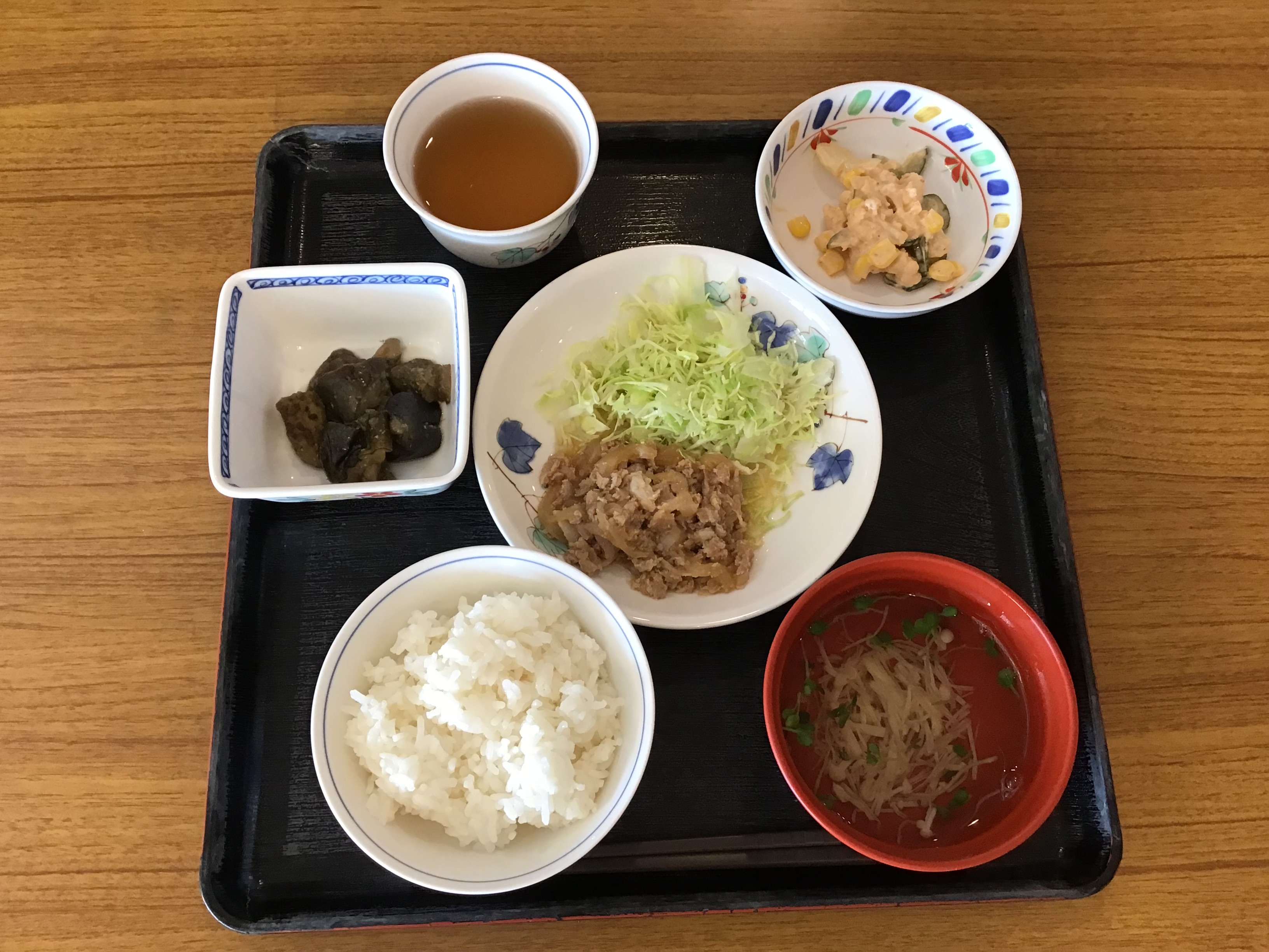 献立のメニューは、豚肉の生姜焼きと揚げ茄子のお浸し、カリフラワーサラダとフルーツです。