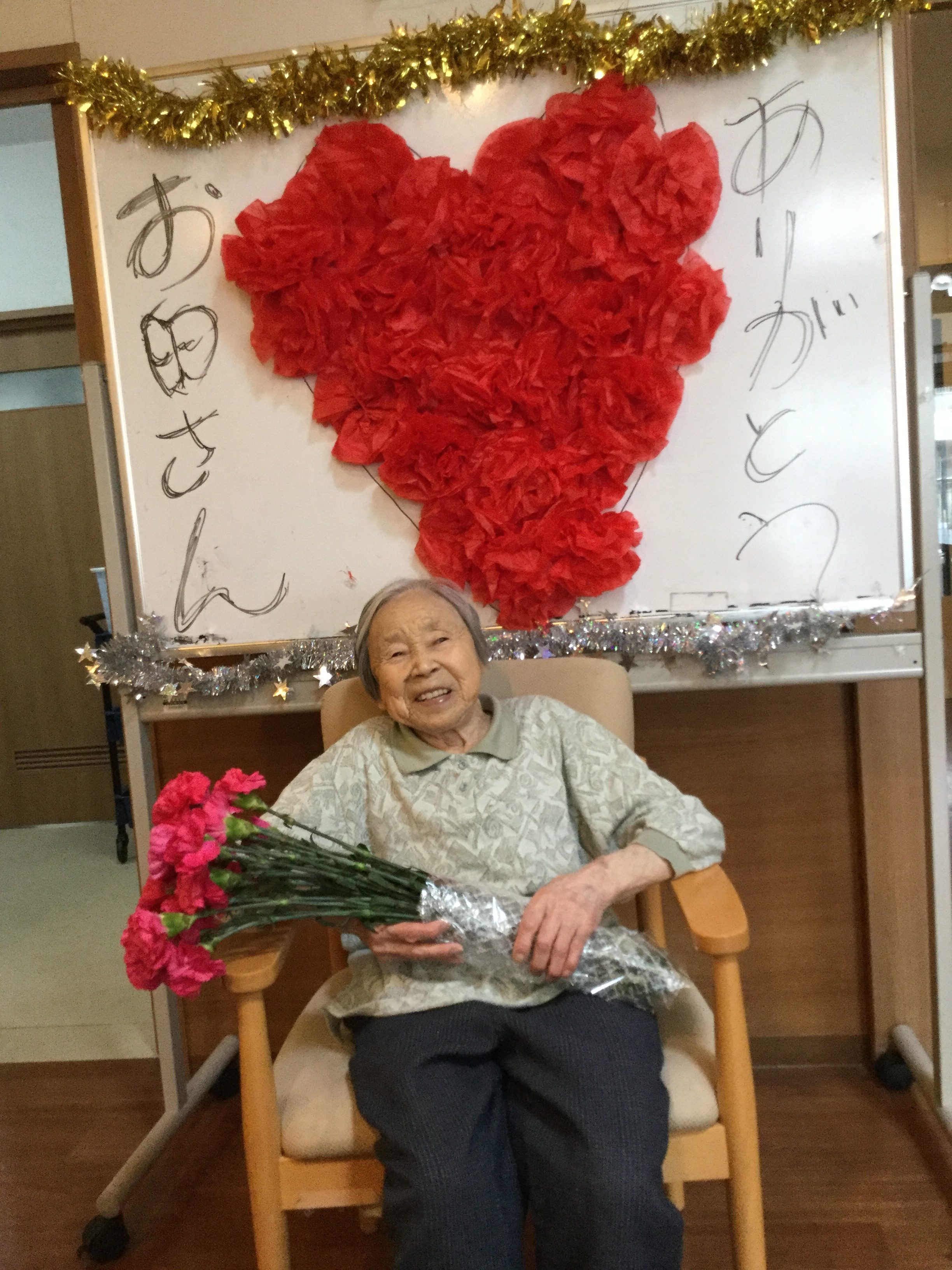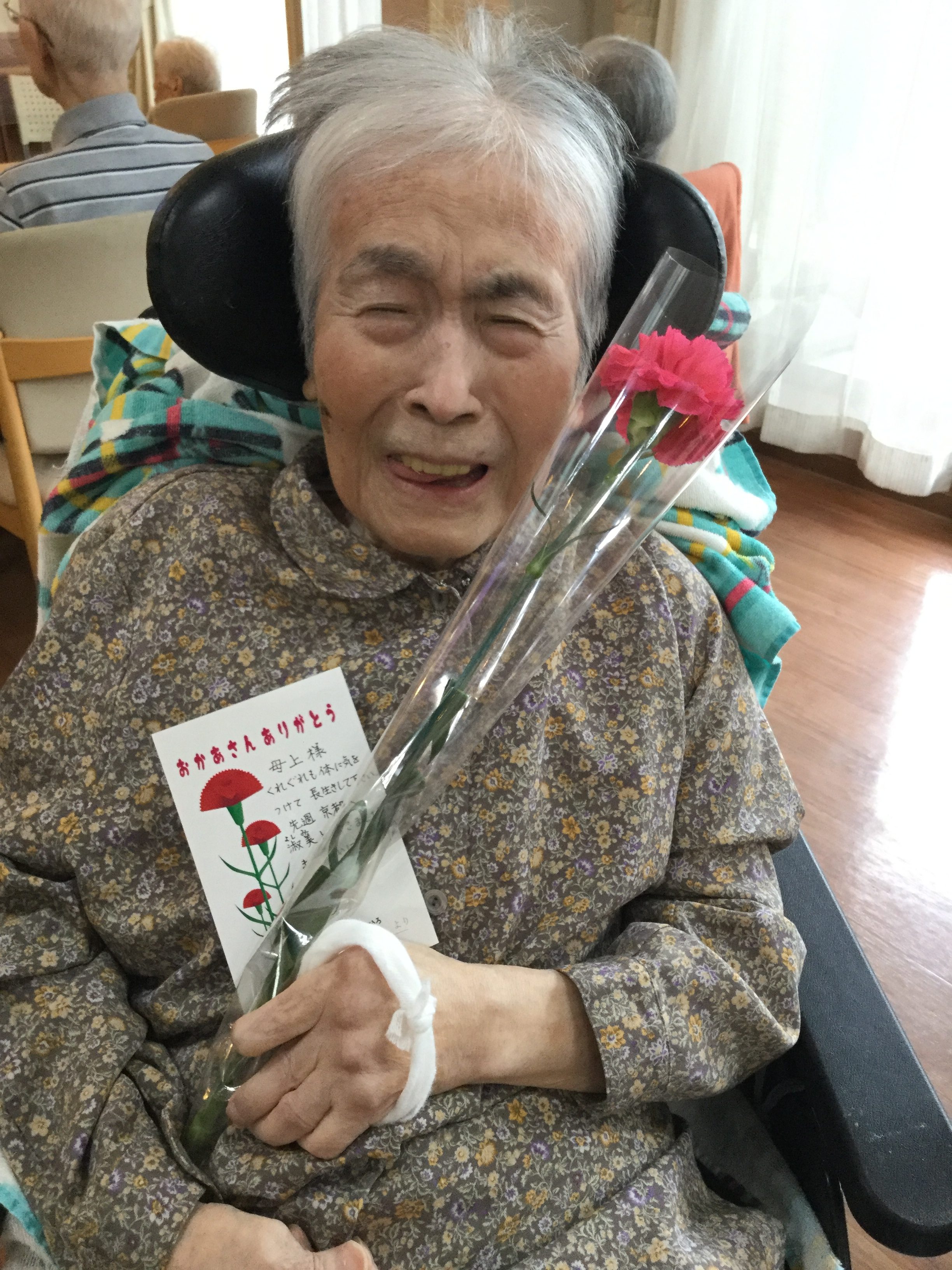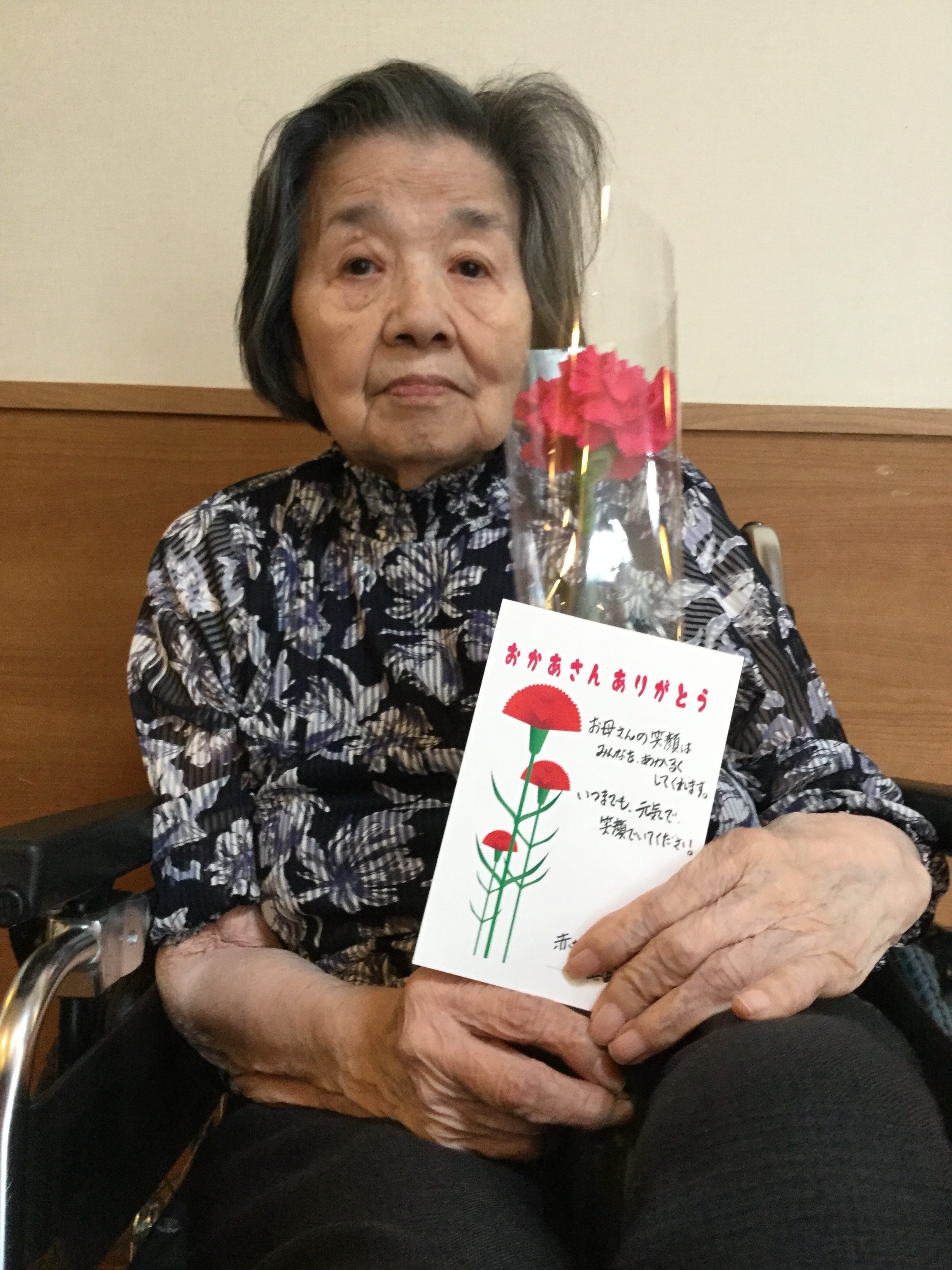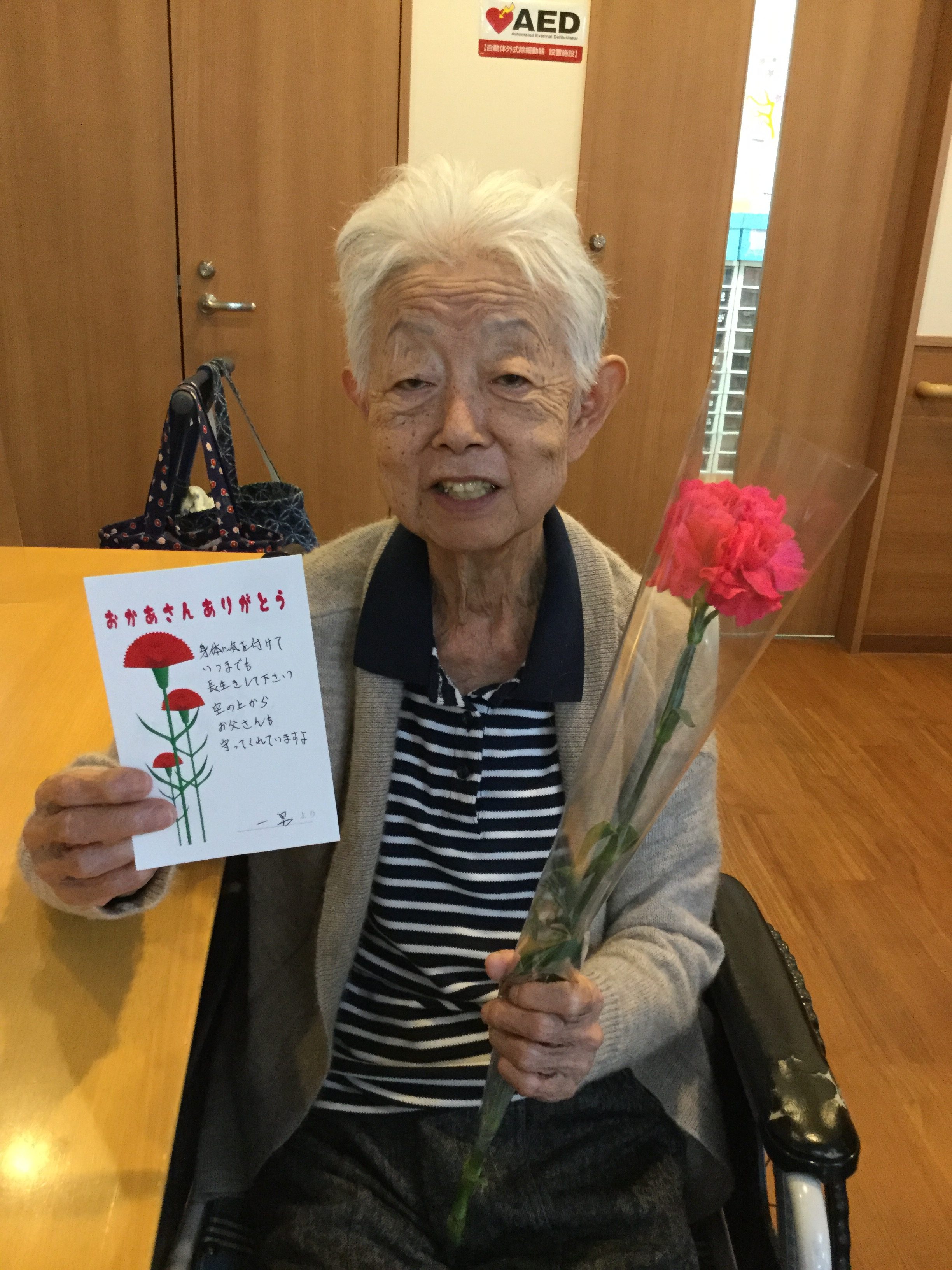 母の日当日は、届いたカードと赤いカーネーションをお渡しいたしました。