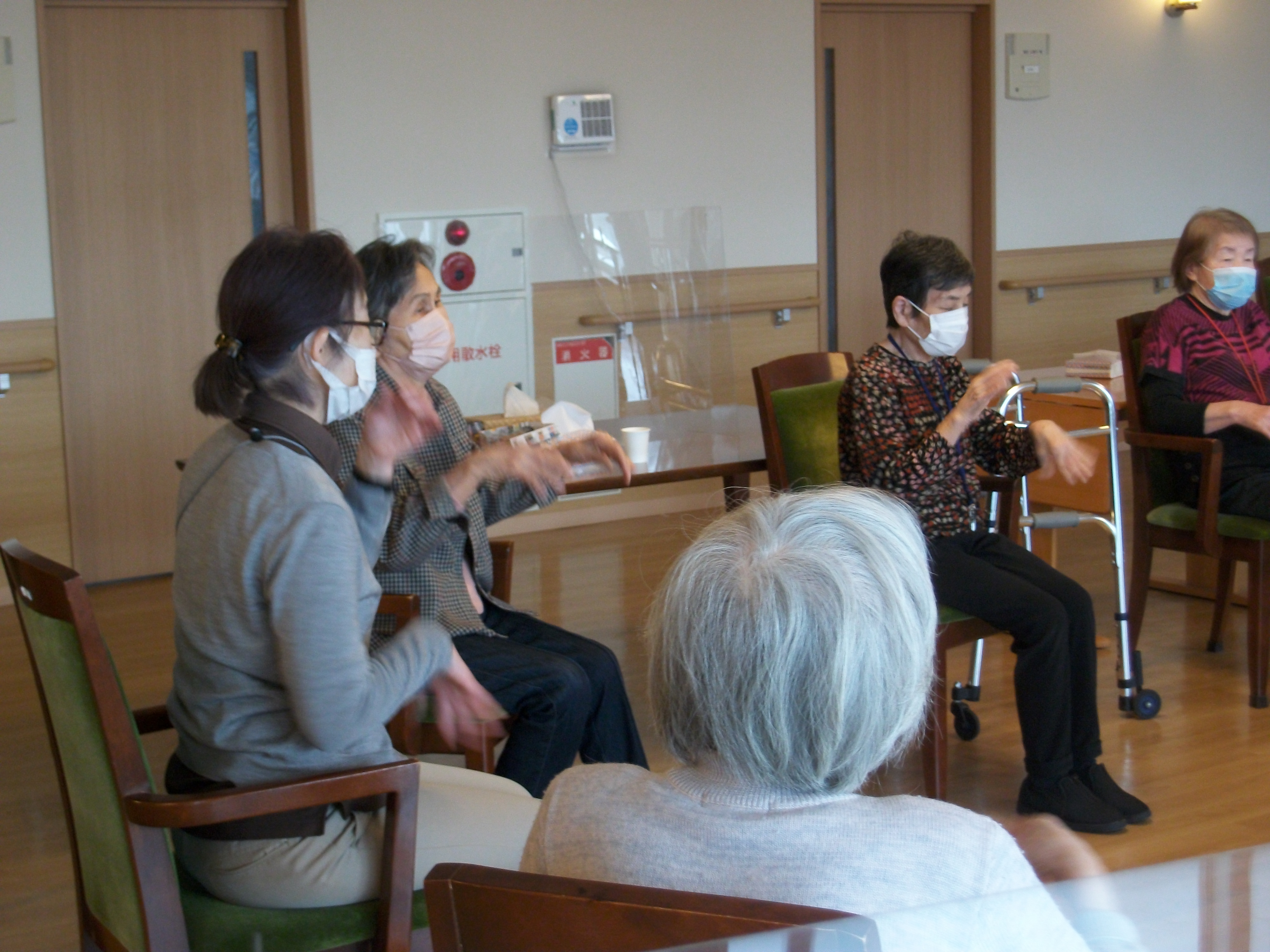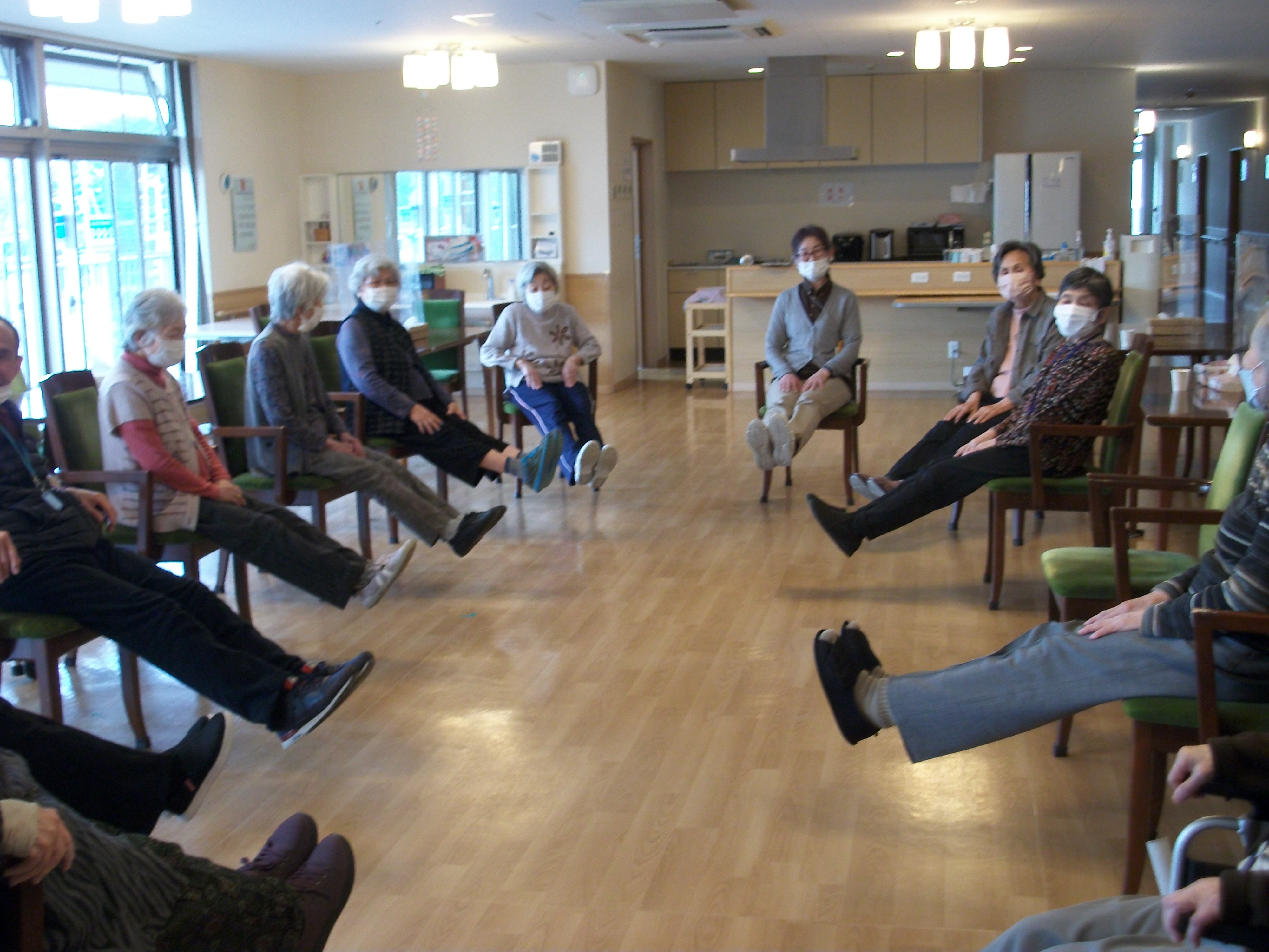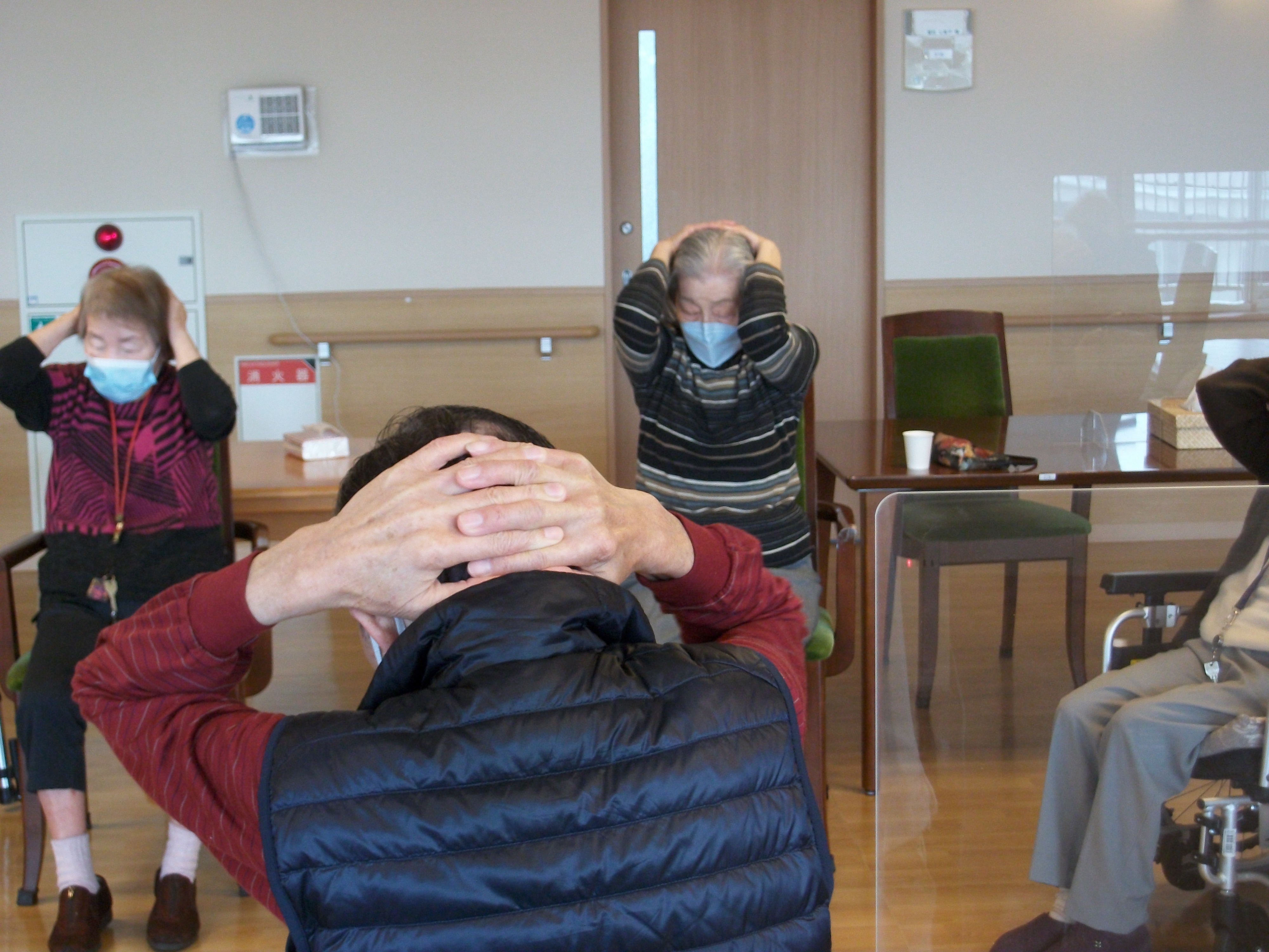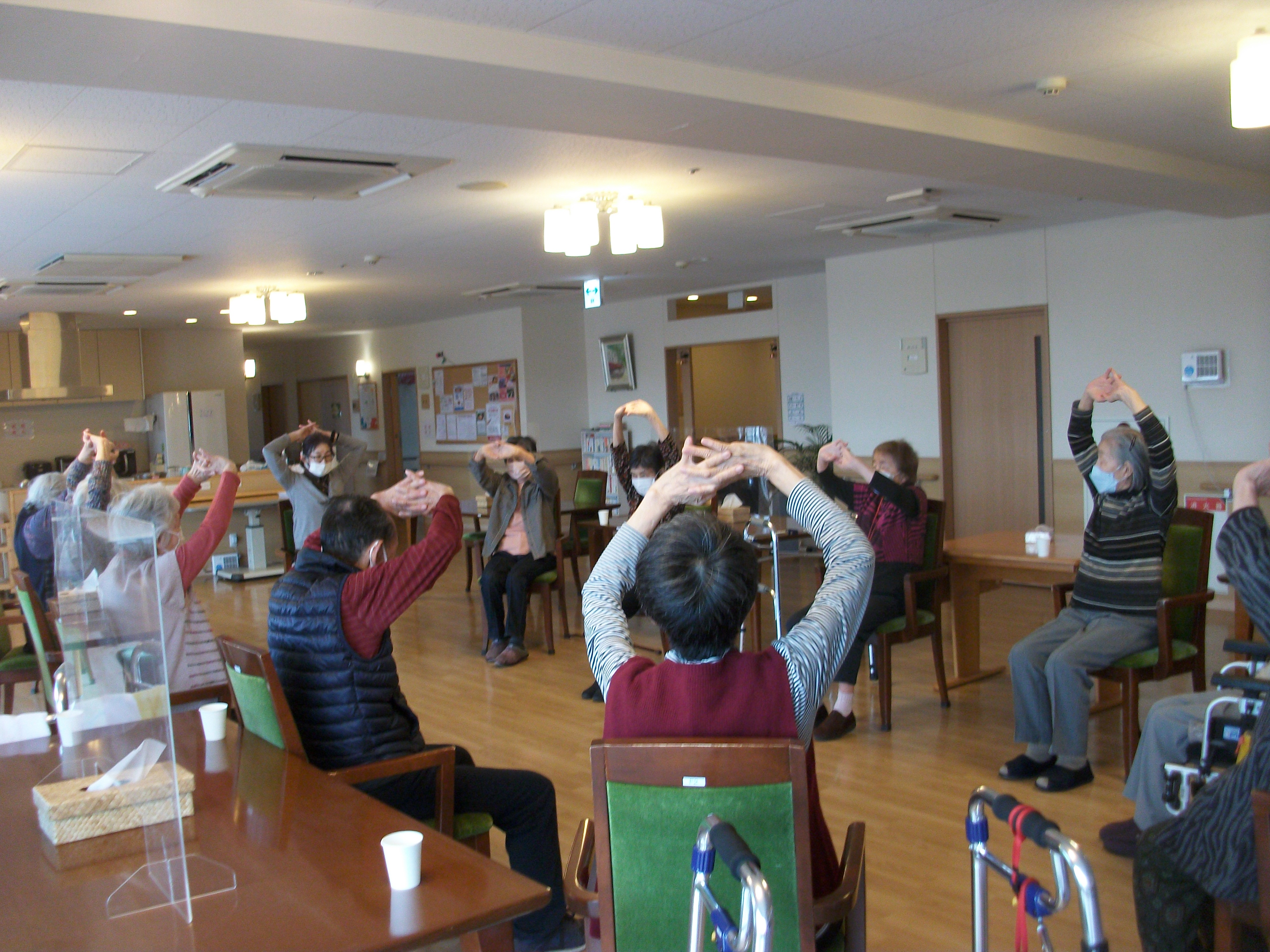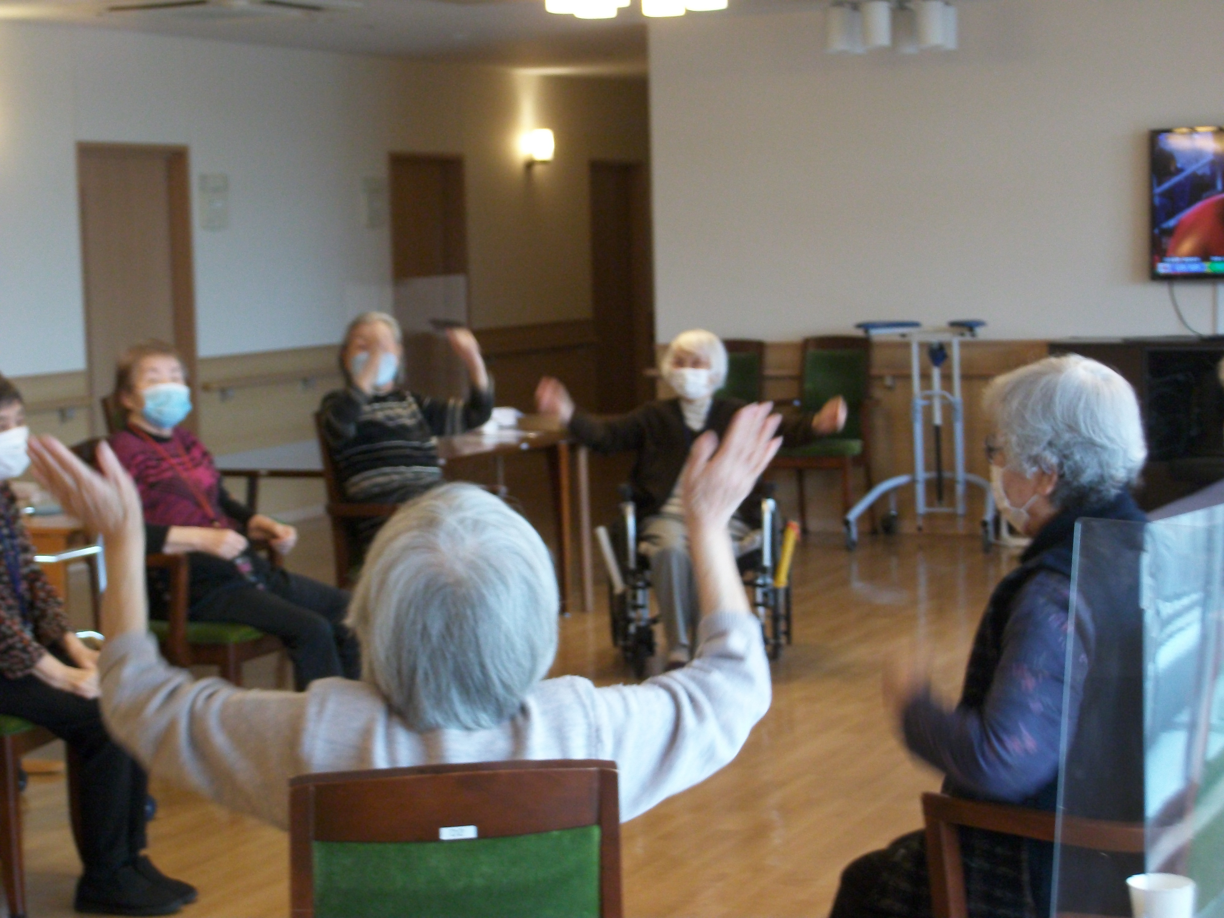 テレビを見ながらの応援と平行して健康体操をしていました。