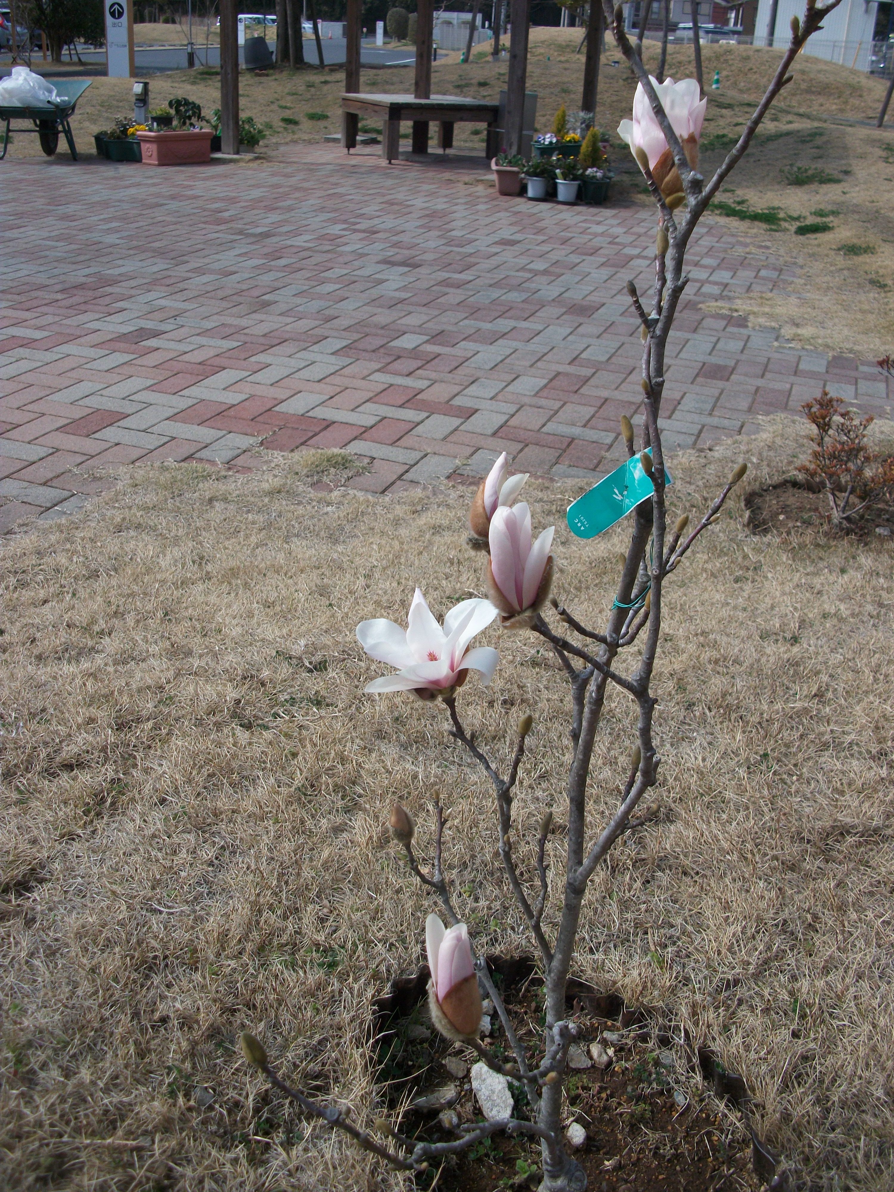 畑にはクロッカス、中庭にの花壇には雪柳、中庭の芝生には木蓮、ヴィラのロビーには菜の花と