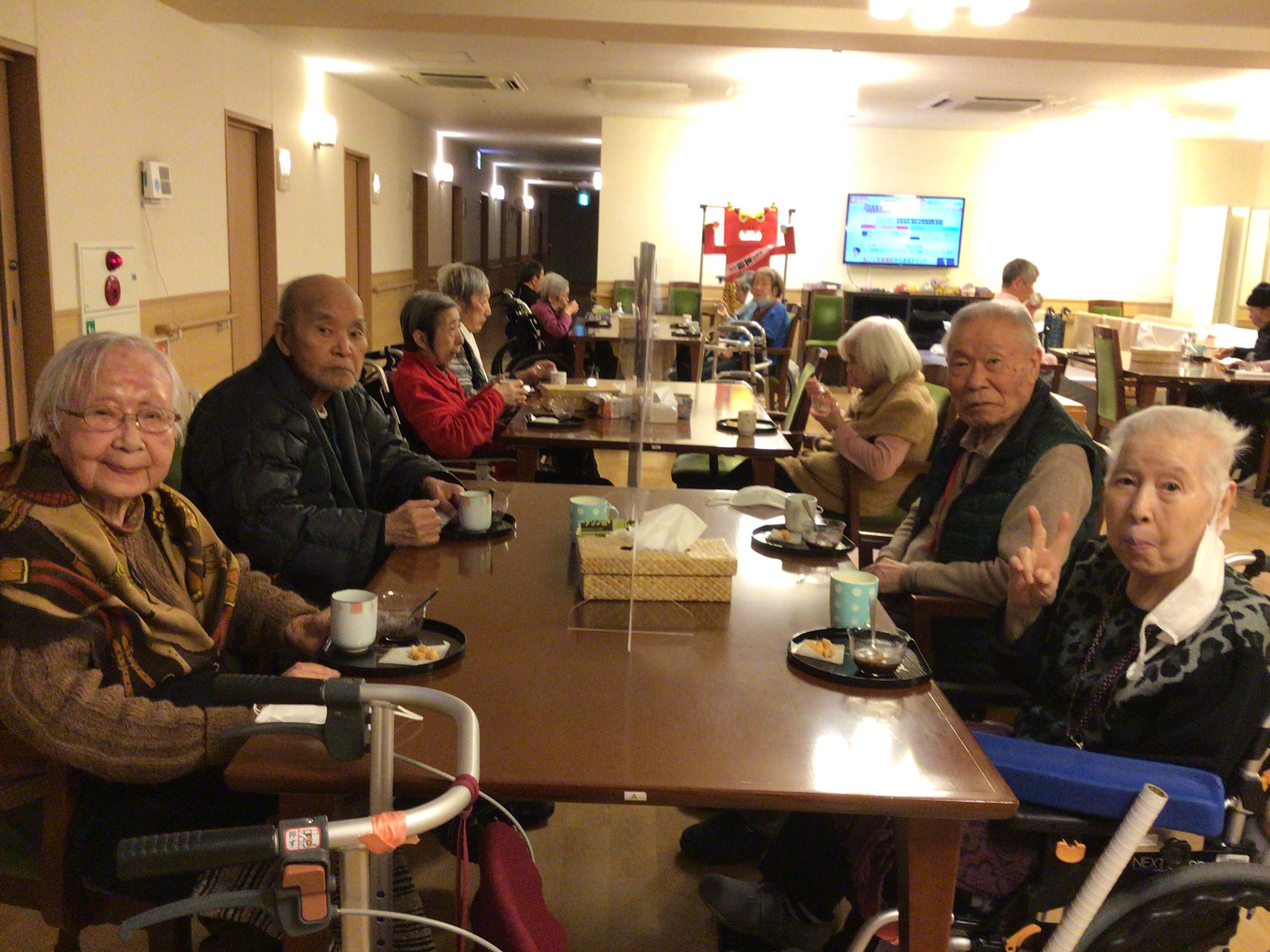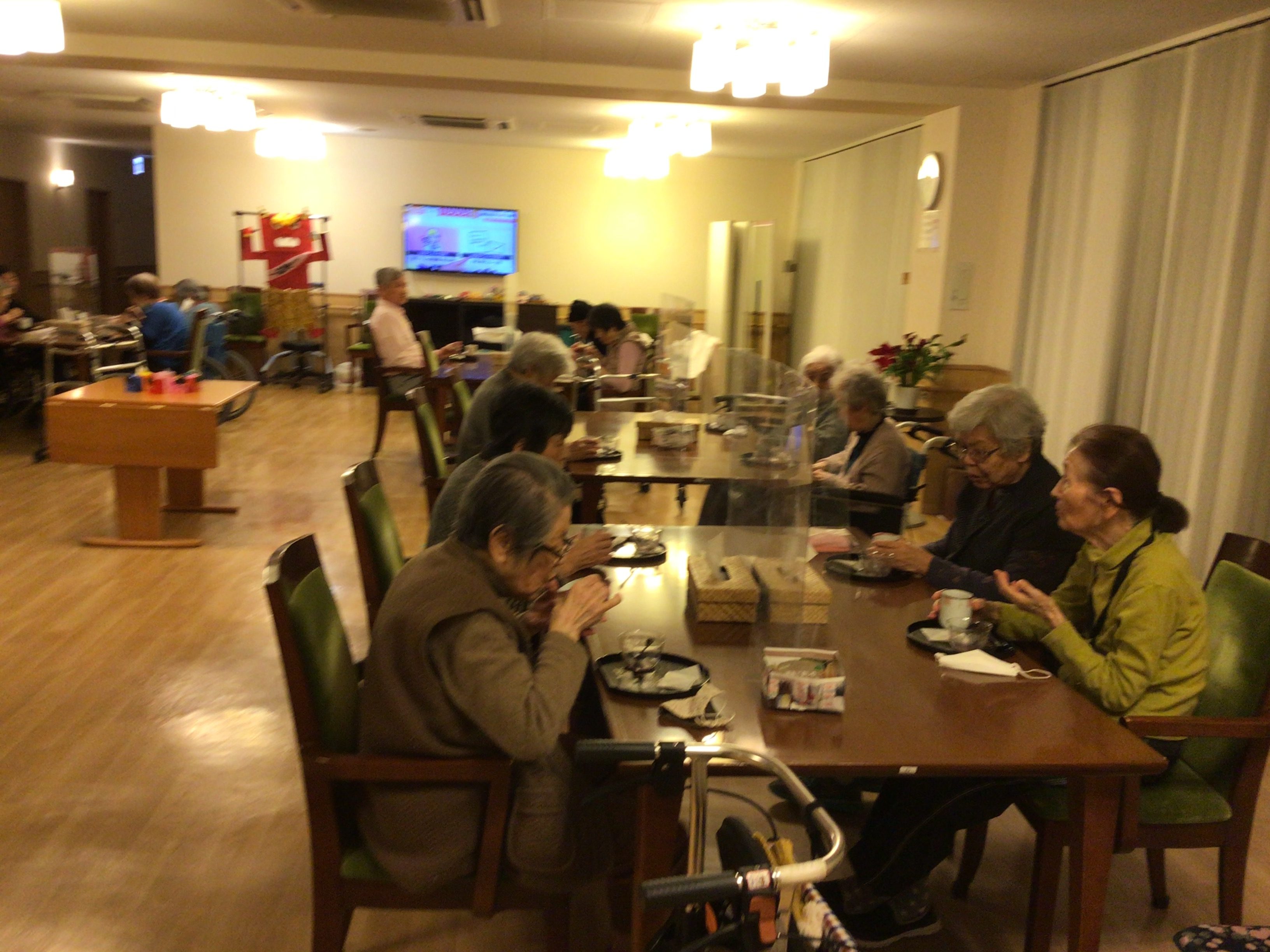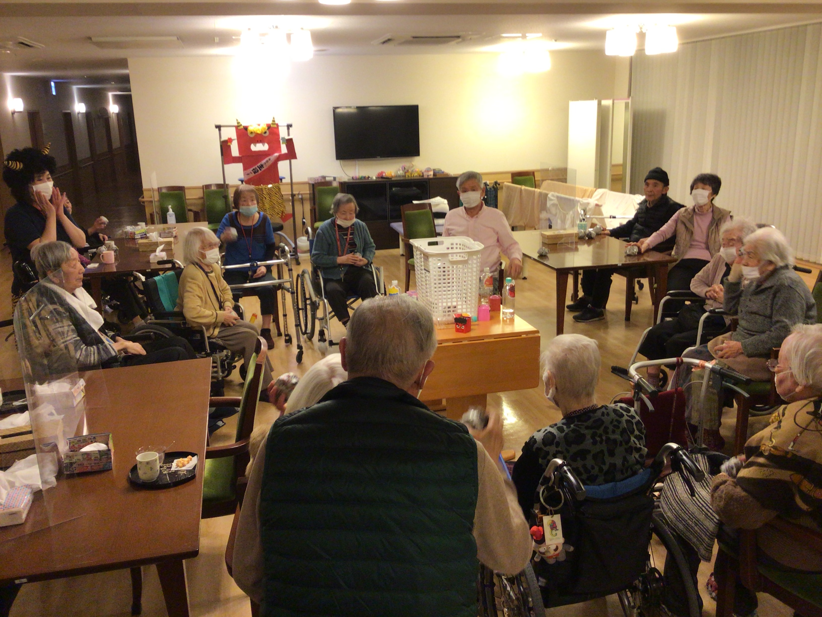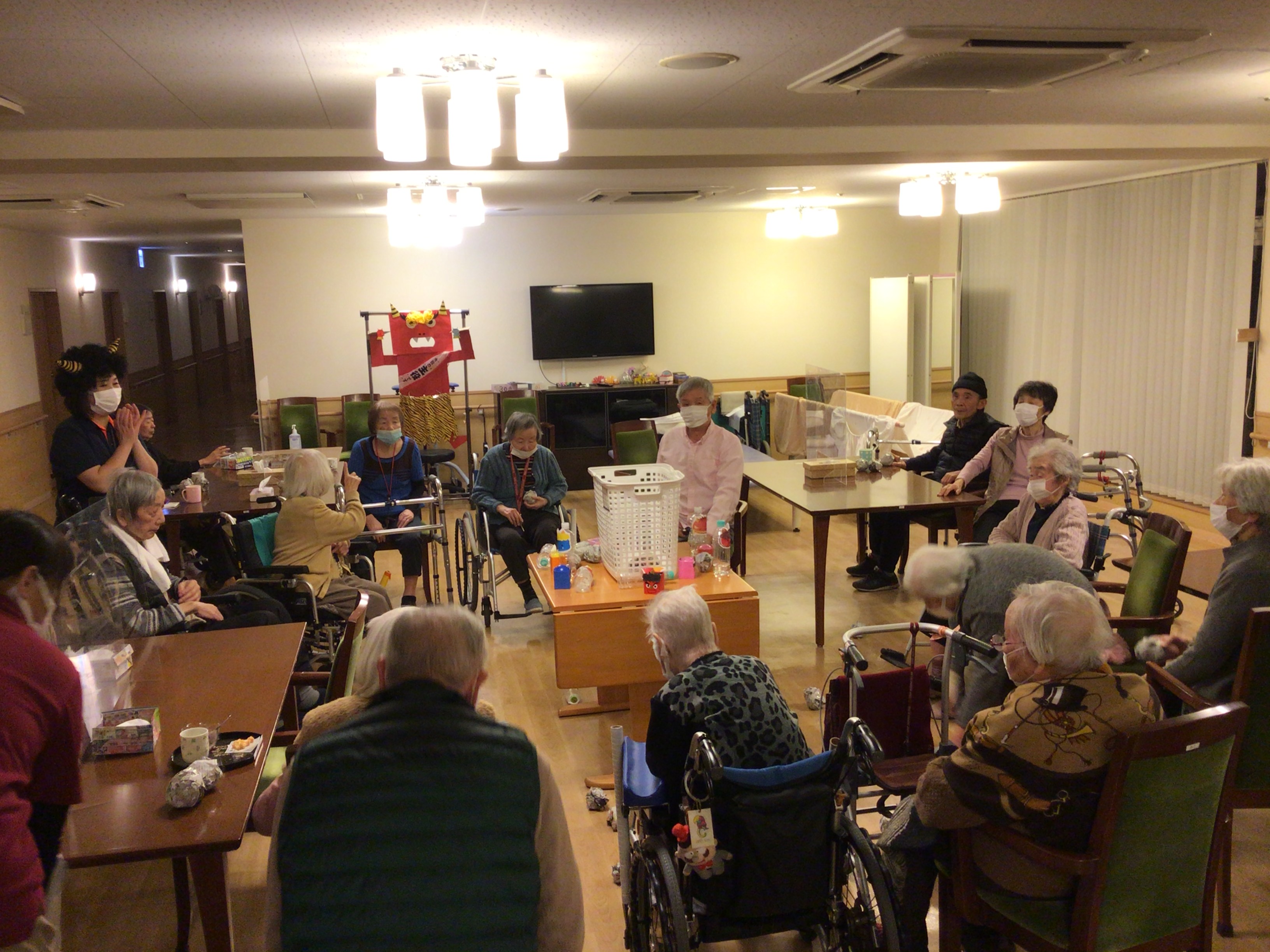2月のスペシャルおやつの前に、みなさんで玉入れゲームの運動をしてから