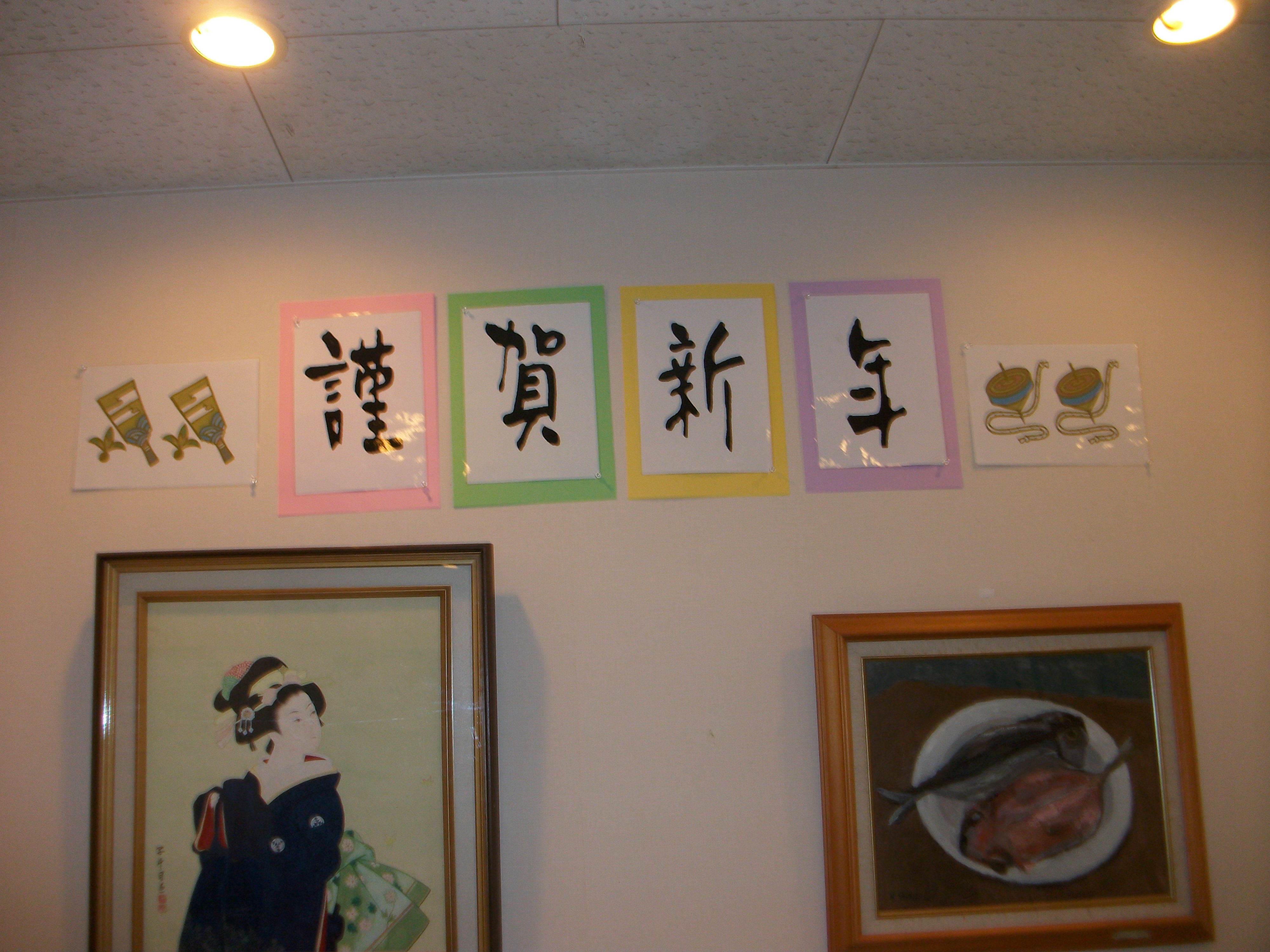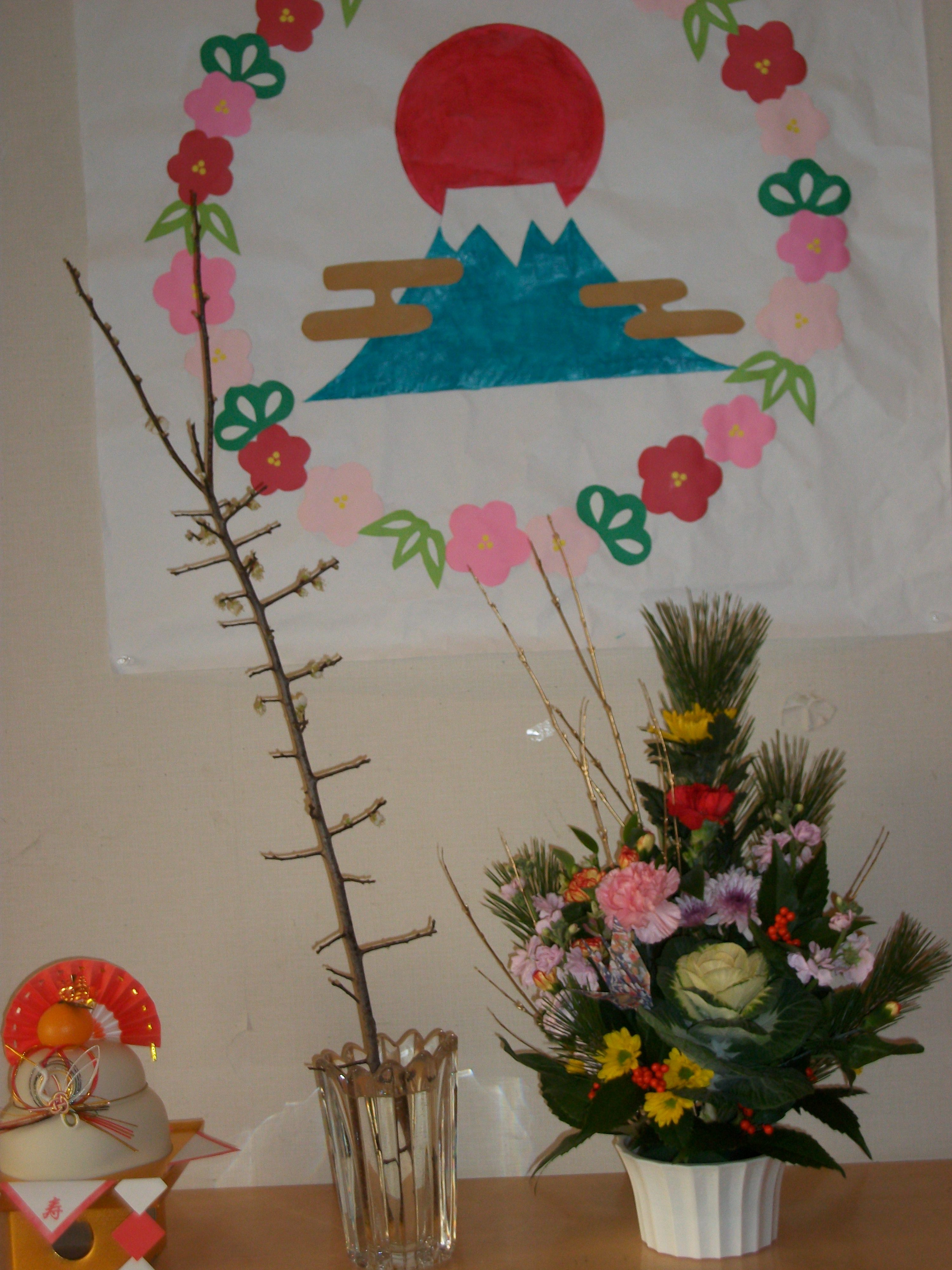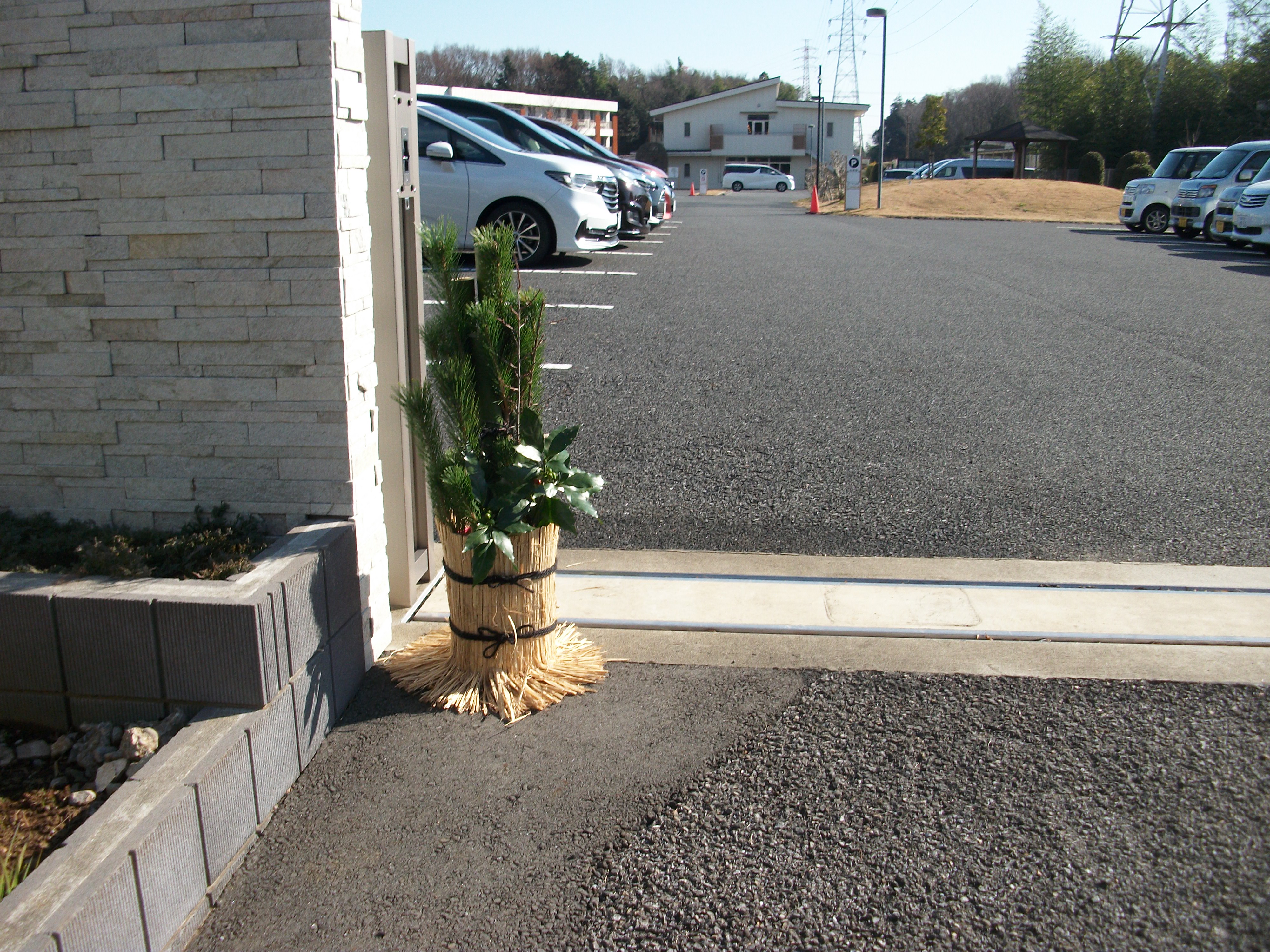 立派な門松が玄関先に、駐車場入り口には手作りの門松、建物に入ると凧やおめでたい生花が